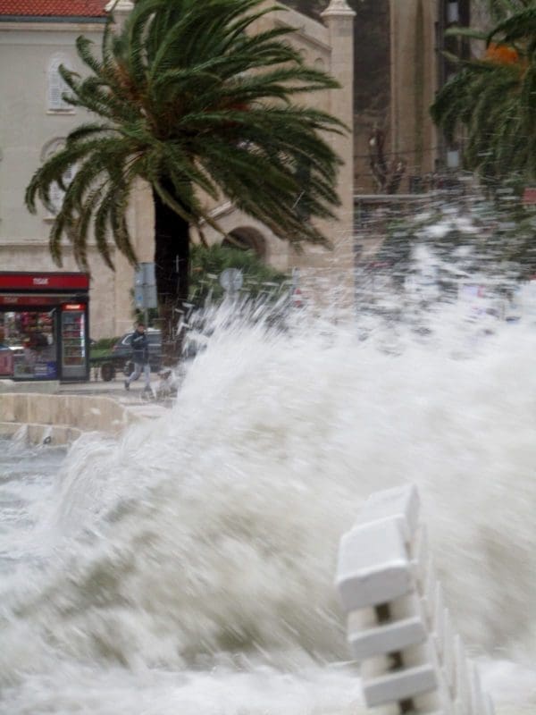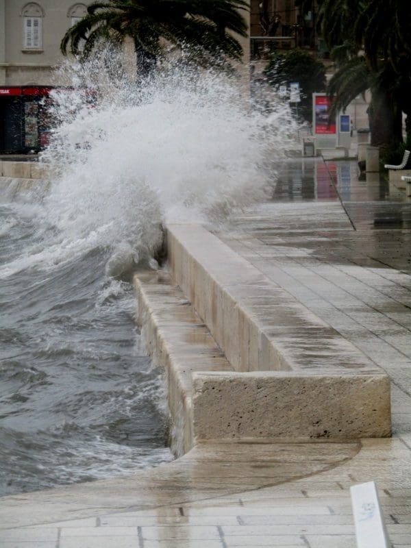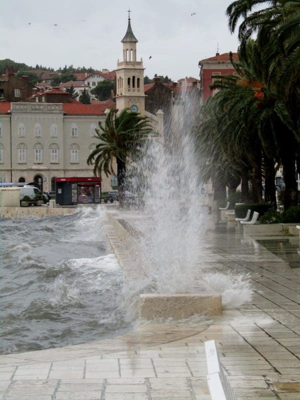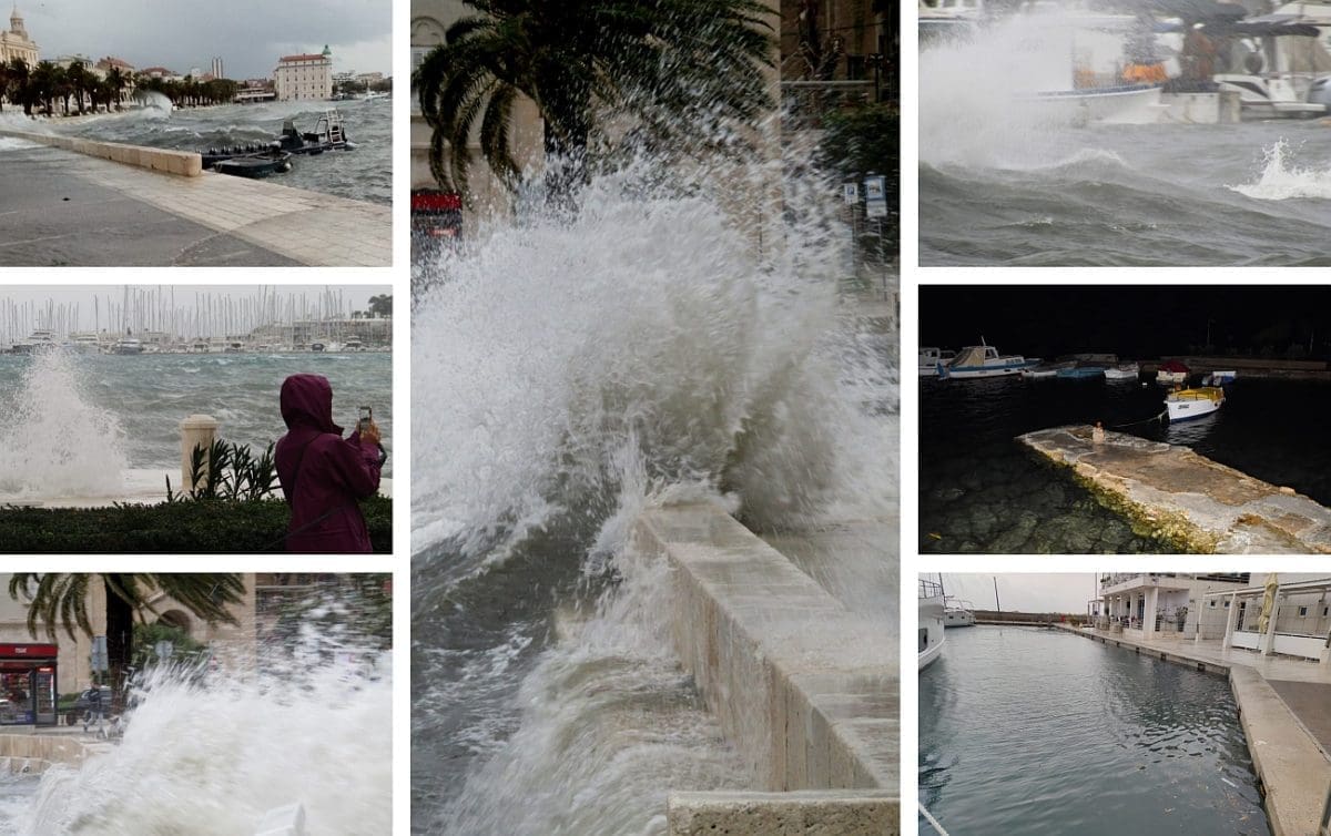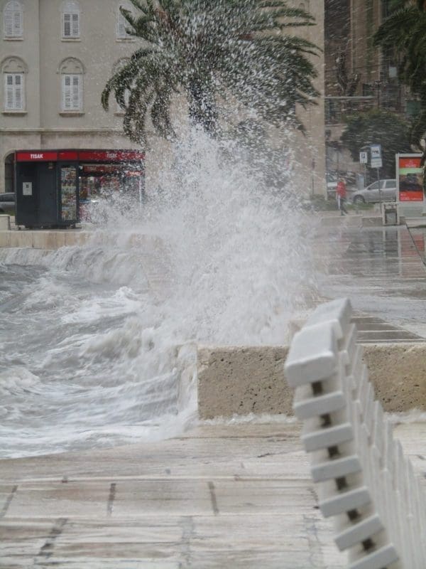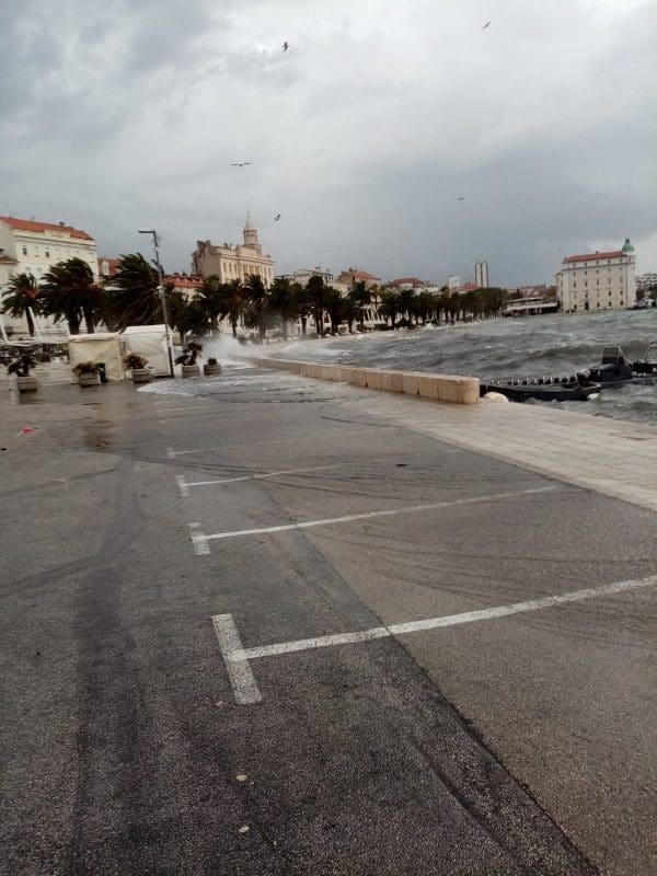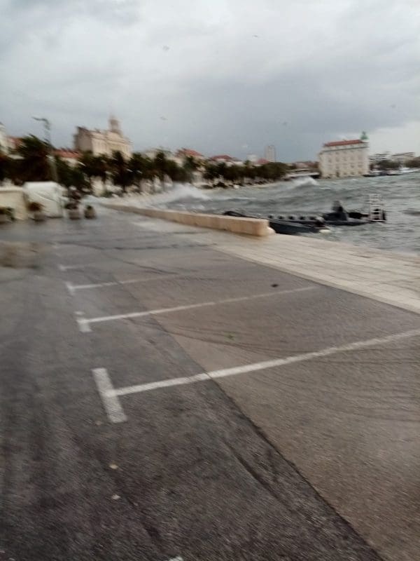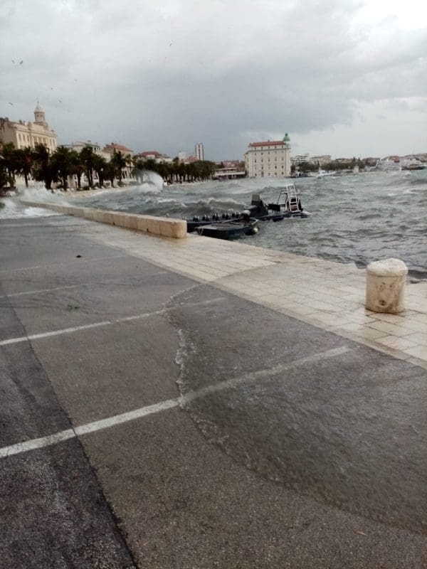 Niski tlak i snažan vjetar donijeli su noćas i ranije jutros ciklonalnu plimu u mnogim dijelovima Jadrana. Jutros je u Splitu puhao vrlo jaki lebić prosječne brzine 15 m/s, a zbog povišene razine mora valovi su se prelijevali na Rivu. Uslijed plime i valova, manja oštećenja zabilježena su na nekoliko brodica na Matejuški.