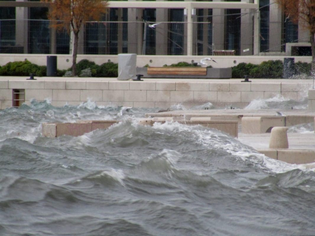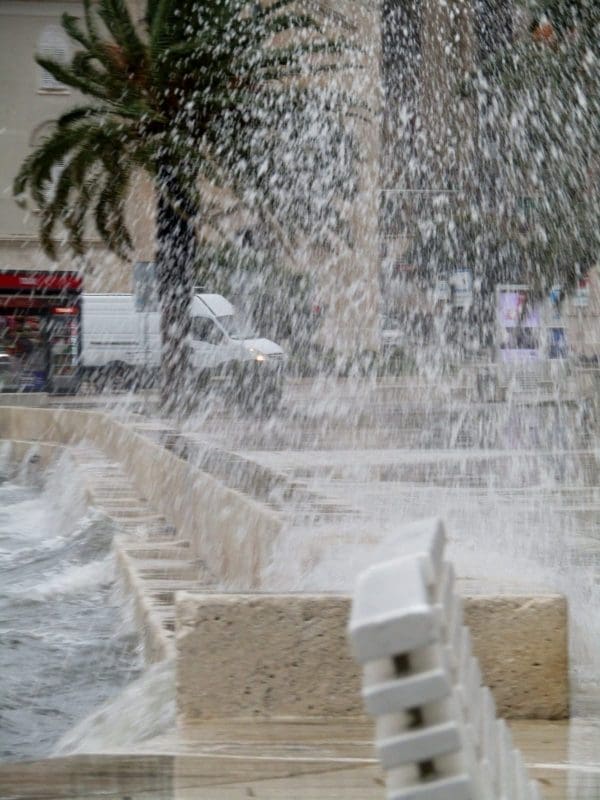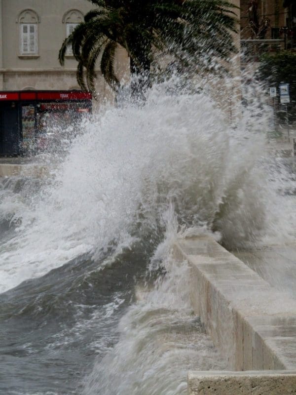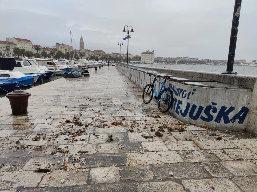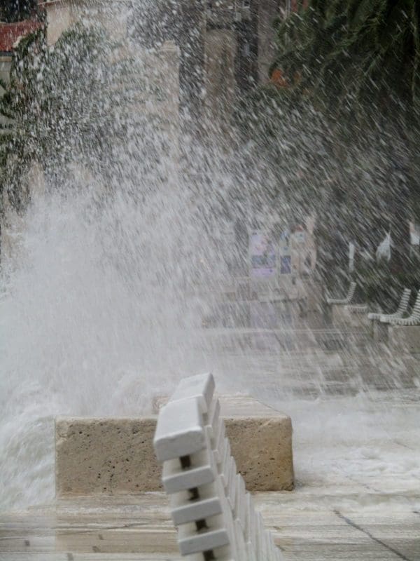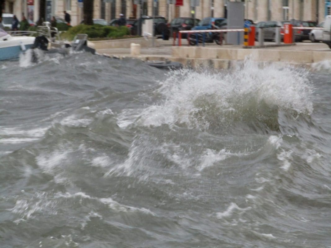 Niski tlak i snažan vjetar donijeli su noćas i ranije jutros ciklonalnu plimu u mnogim dijelovima Jadrana. Jutros je u Splitu puhao vrlo jaki lebić prosječne brzine 15 m/s, a zbog povišene razine mora valovi su se prelijevali na Rivu. Uslijed plime i valova, manja oštećenja zabilježena su na nekoliko brodica na Matejuški.