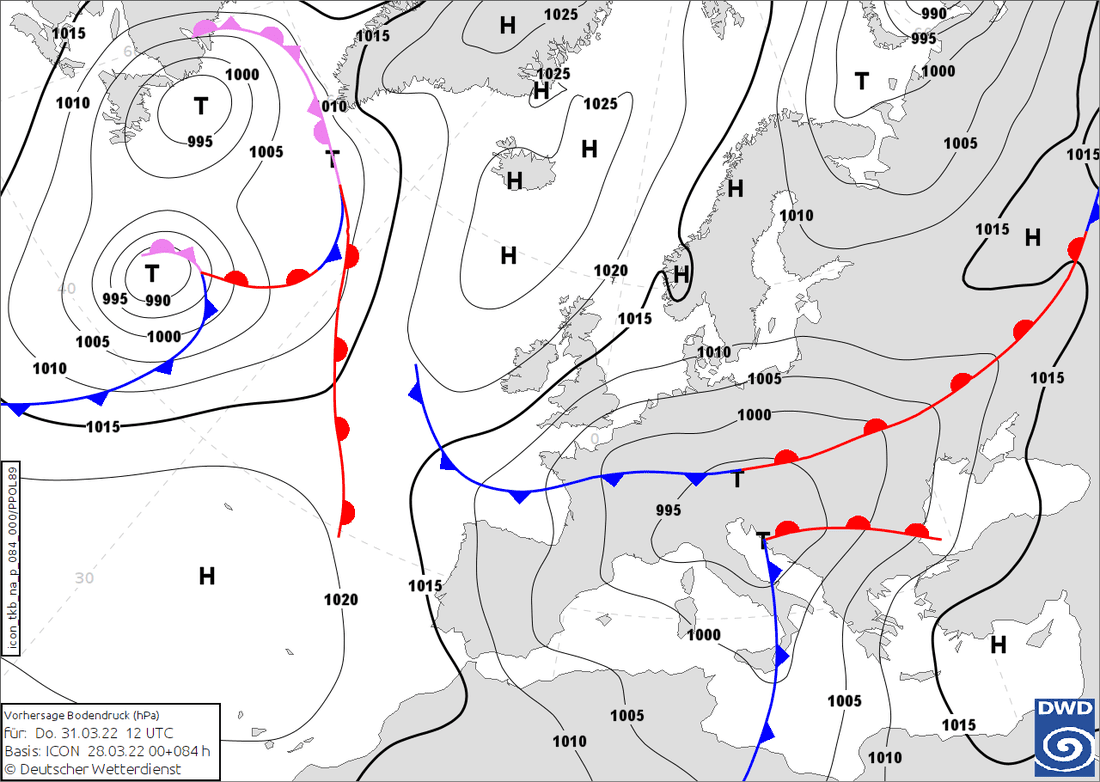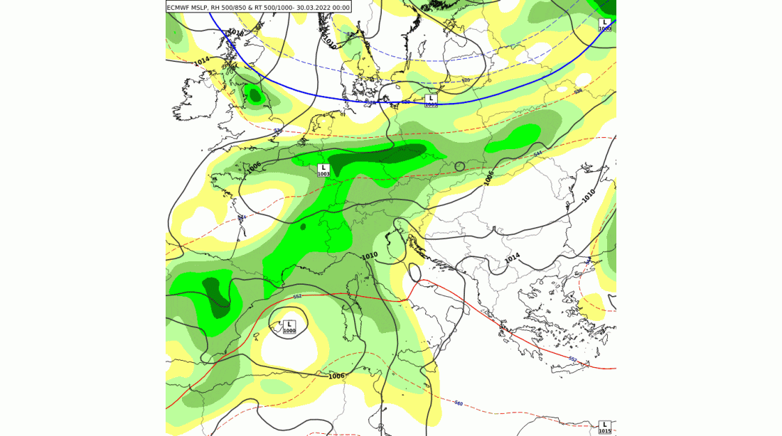 Tijekom srijede uspostavlja se jugozapadno visinsko strujanje na prednjoj strani prostrane termobaričke doline nad zapadnom Europom koja će se postupno približiti našim krajevima. U nižim slojevima atmosfere nad Sredozemljem će doći do procesa ciklogeneze (stvaranja ciklona) (Slika 1). Pritom će se ciklone premještati preko Hrvatske donoseći najprije razmjerno topao te vlažan i nestabilan zrak, a od petka osjetno hladniji (Animacija 1).