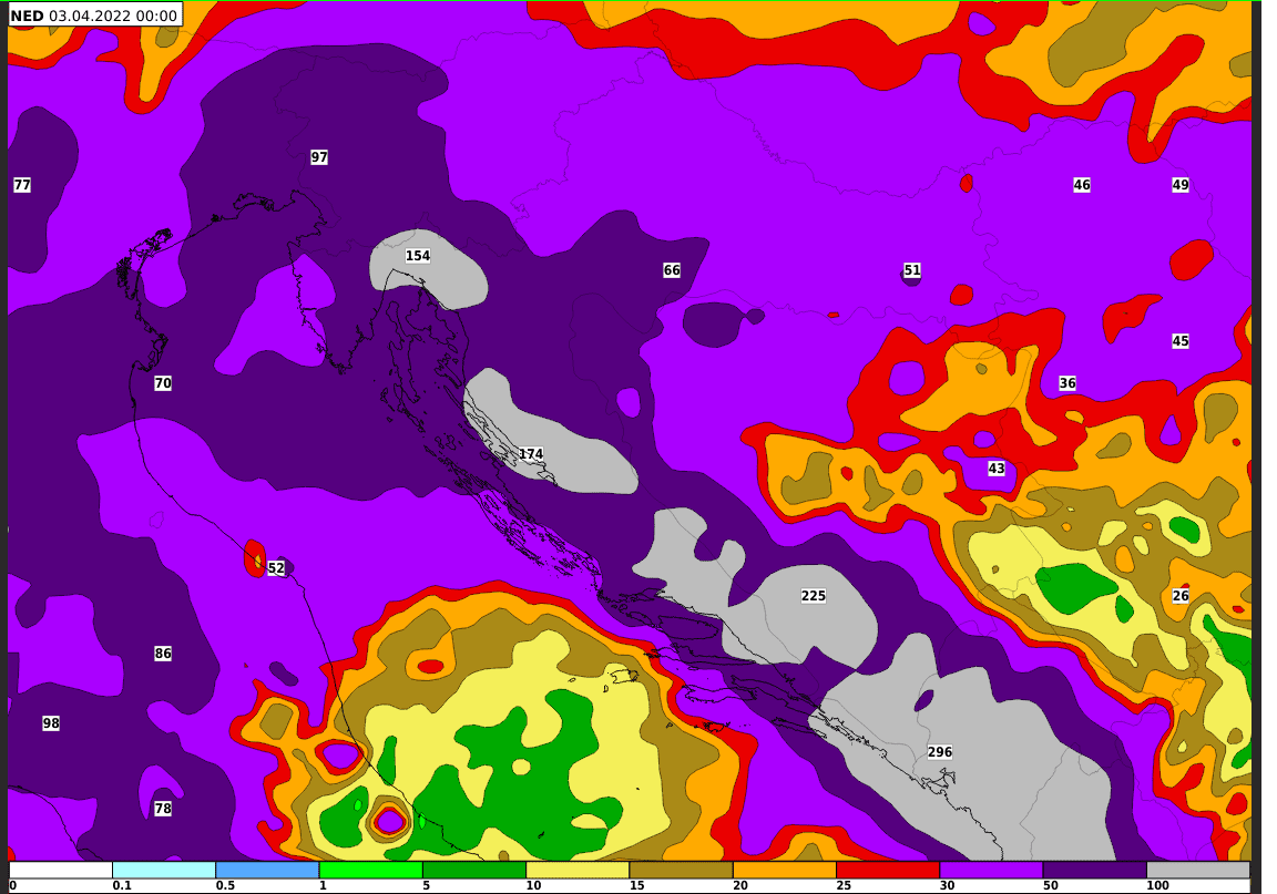 Kiše će već u srijedu najprije biti na Jadranu i u predjelima uz njega, a zatim i drugdje u unutrašnjosti. Pritom će na Jadranu biti i pljuskova s grmljavinom, mjestimice izraženih, a moguće je i nevrijeme. Tijekom oborinske epizode, u razdoblju od srijede, 30. 3., do subote, 2. 4., ponegdje se na Jadranu i uz njega očekuju akumulirane količine oborine veće od 100 mm, a u središnjim i istočnim predjelima veće od 30 mm (Slika 2).