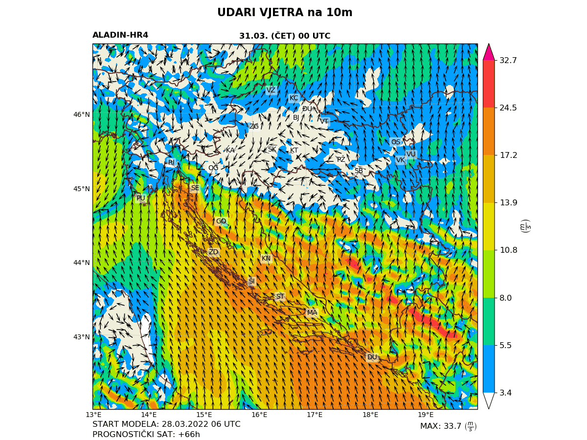 Osim značajnih količina oborine, bit će i vjetrovito, osobito na Jadranu uz jako i olujno jugo (Slika 3) te povremeno južni i jugozapadni vjetar.