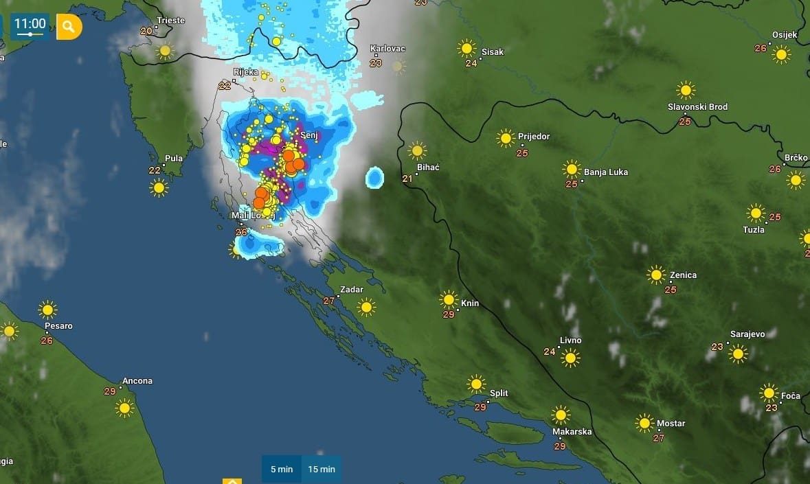 Olujni oblak potom se premjestio nad Kvarner i dio Gorskog kotara, a oko 11 sati sustav je već stigao do zapadnih granica Like i Dugog otoka.