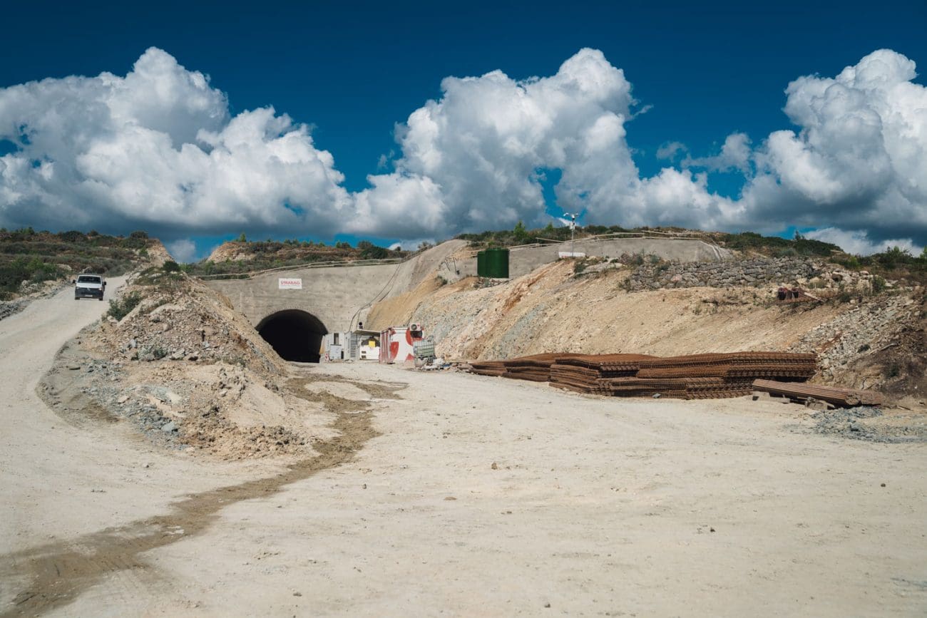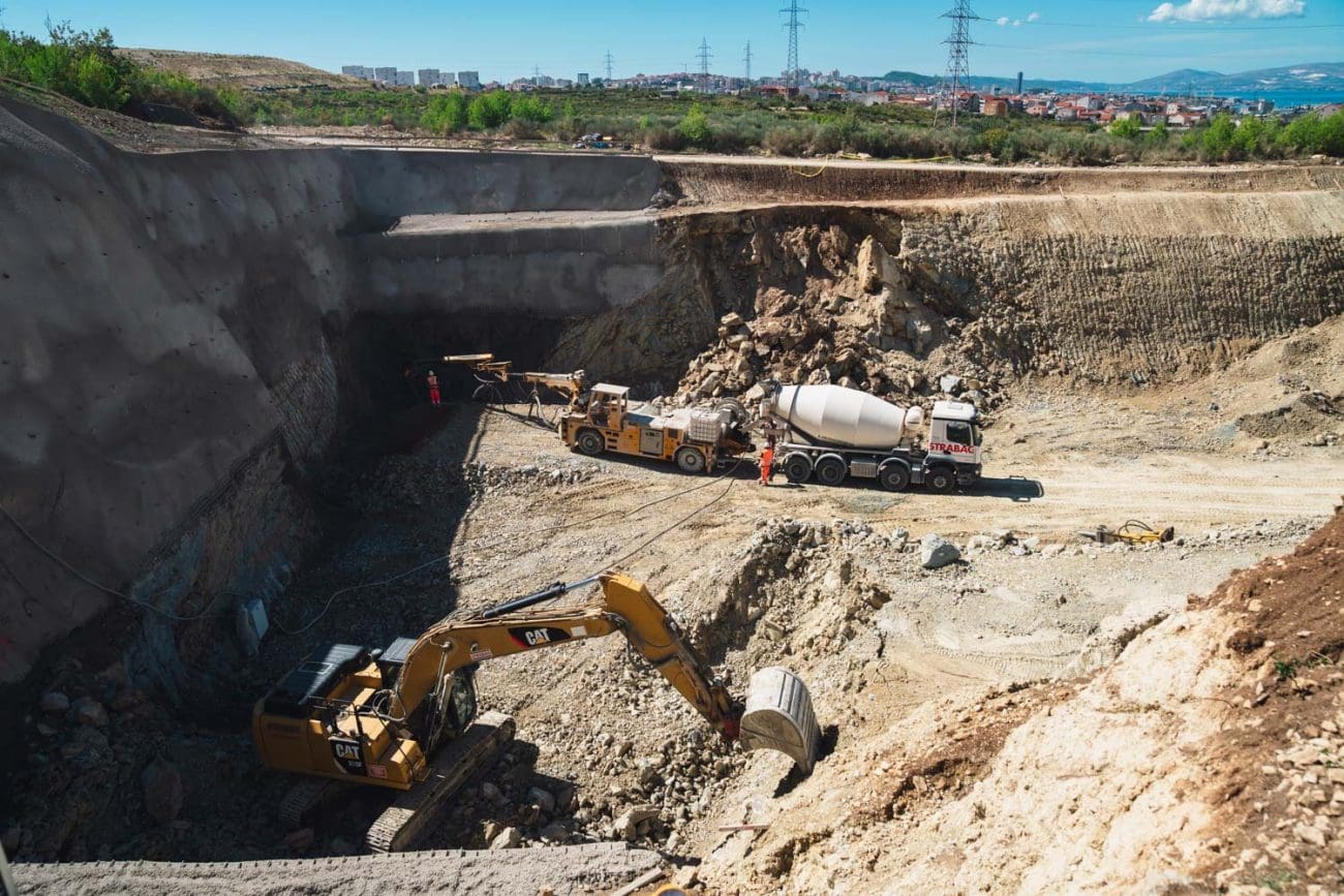 U međuvremenu smo stigli na istočni dio gradilišta, prema Stobreču. Tunel ima još niti stotinjak metara iskopa, a radovi su mjestimično u betonima, mjestimično još nije ni raskrčeno zelenilo. Vide se stupovi novog nadvožnjaka – postojeća trasa dakle ide prema TTTS-u, a nadvožnjak je ostavljen za budući novi izlaz iz grada.