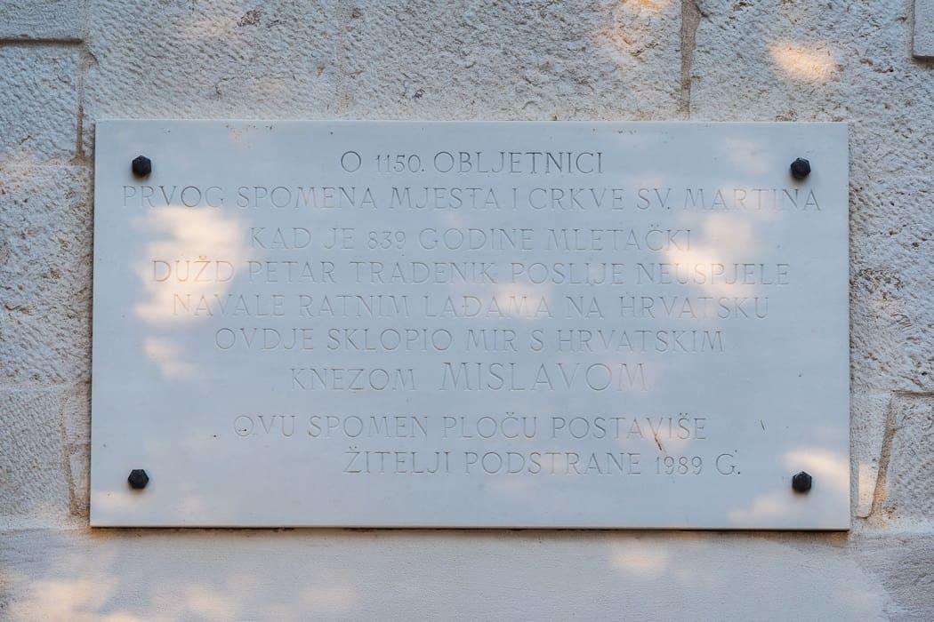 – Priča kaže da je upravo u toj kući Artoriusa Castusa, naš knez Mislav, potpisao mirovni sporazum iz 839. godine. To, uostalom i piše na spomen ploči na crkvici sv. Martina: "O 1150. obljetnici prvog spomena mjesta i crkve sv. Martina, kad je 839. godine mletački dužd Petar Tradenik poslije neuspjele navale ratnim lađama na Hrvatsku ovdje sklopio mir s hrvatskim knezom Mislavom. Ovu spomen ploču postaviše žitelji Podstrane 1989. godine".