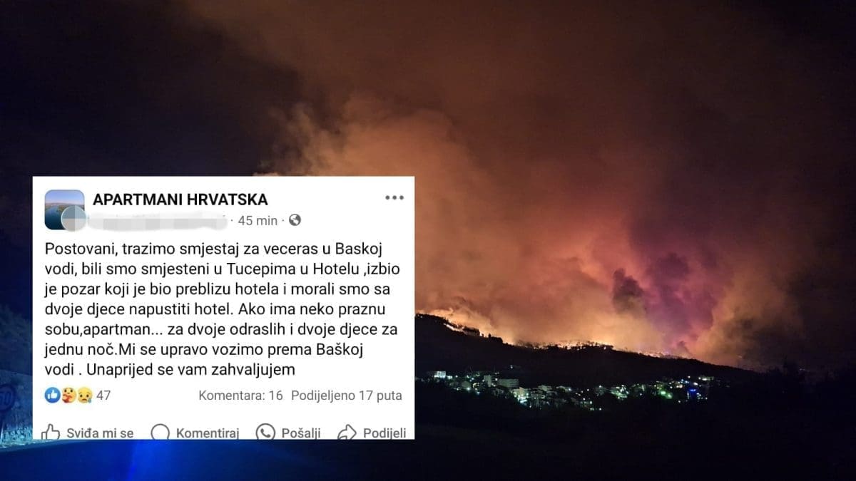 "Poštovani, tražimo smještaj za večeras u Baškoj Vodi, bili smo smješteni u Tučepima u hotelu. Izbio je požar koji je bio preblizu hotela i morali smo s dvoje djece napustiti hotel. Ako netko ima praznu sobu, apartman za dvoje odraslih i dvoje djece za jednu noć. Mi se upravo vozimo prema Baškoj Vodi. Unaprijed se zahvaljujem", napisala je turistica u Facebook grupi.