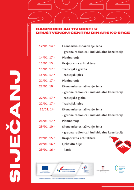 Program započinje 12. siječnja u 14 sati radionicama ekonomskog osnaživanja žena koji će se nastaviti održavati kroz cijeli mjesec s naglaskom na mogućnosti, prilike, izazove i prepreke za žene poduzetnice na ruralnim prostorima. Vikendom će se provoditi aktivnosti krajobrazne arhitekture, tradicijskog plesa i glazbe za sve uzraste. Korisnici će također uživati u programu planinarenja i ljekovitog bilja i radionici tkanja 29. siječnja čime završava program za ovaj mjesec.