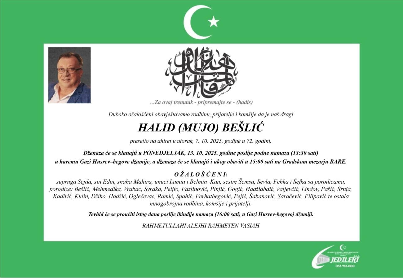Tuga i nevjerica i dalje vladaju regijom nakon vijesti o smrti Halida Bešlića, jednog od najvoljenijih pjevača s ovih prostora. Njegova obitelj objavila je osmrtnicu u kojoj s dubokom boli obavještava rodbinu, prijatelje i sve poštovatelje da je Halid (Mujo) Bešlić preselio na ahiret u utorak, 7. listopada 2025., u 72. godini života.