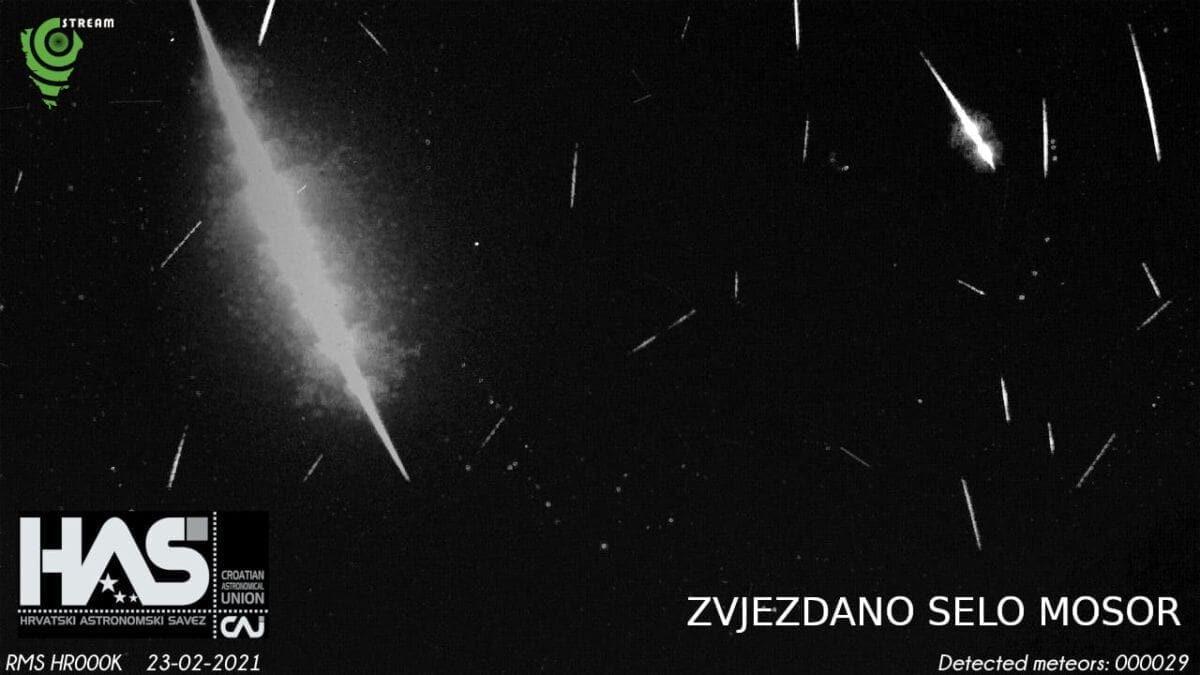 "U noći s 22. na 23. veljače 2021. točnije 23.02.2021. u 00 sati 00 minuta i 23 sekunde po lokalnom vremenu kamere Hrvatske meteorske mreže (Global Meteor Network) snimile su vrlo sjajan meteor, bolid nešto slabijeg sjaja od Mjeseca u fazi prve četvrti.