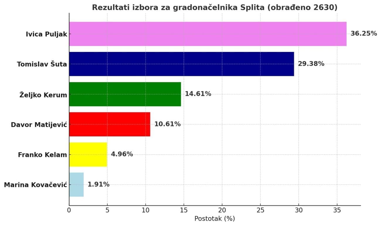 Prema prvim izlaznim anketama za izbor gradonačelnika Splita objavljenim u 19 sati, kandidat stranke Centar Ivica Puljak preuzeo je vodstvo s osvojenih 36,25% glasova, čime se pozicionirao kao glavni favorit za ulazak u drugi krug. Iza njega, s 29,38% potpore birača, nalazi se kandidat HDZ-a i partnera Tomislav Šuta, što jasno upućuje na vrlo izgledan drugi krug izbora između njih dvojice.