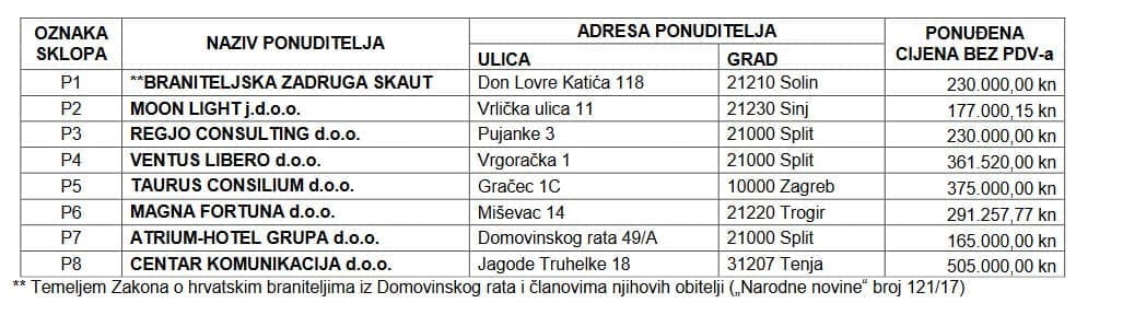 Povjerenstvo za odabir najboljeg ponuđača, kojeg čine direktor Spalatum DMC-a Ante Šunjić te predstavnici Grada Katarina Nataša Merčep i Duje Sučić, nakon kontrole svih prijava objavilo je konačne rezultate.