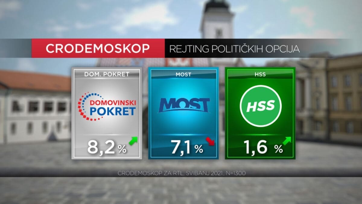 Blizu su im obje desne oporbene opcije. Domovinski pokret, uz rast rejtinga, bira 8.2 posto građana, u odnosu na 7.9 posto prošli mjesec, a Most, uz pad, nešto iznad 7 posto (7.1). Prije mjesec dana imali su podršku od 7.6 posto.