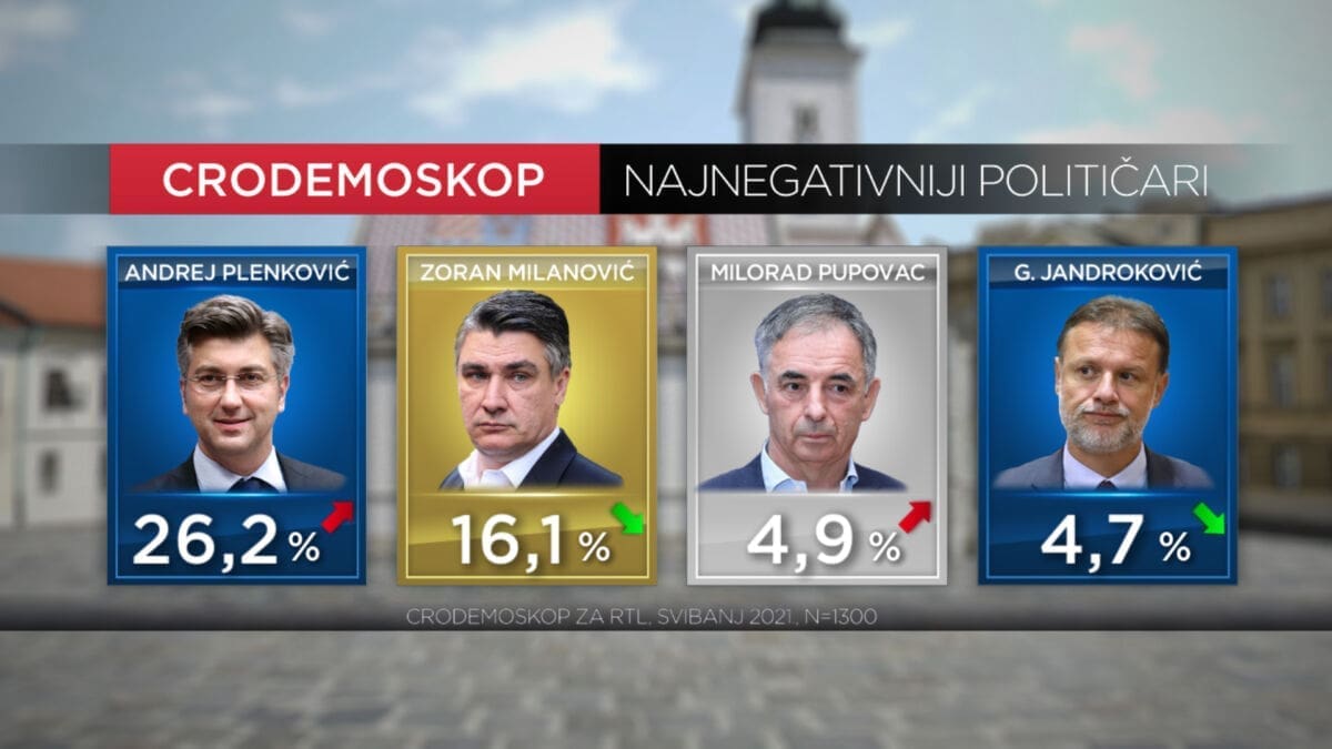 Prošlog je mjeseca treći predsjednik u državi, Gordan Jandroković za 4.8 posto građana bio treći izbor, a sada je s 4.7 posto četvrti. Zato su na poziciju trećeg najnegativca građani odabrali Milorada Pupovca (4.9 posto) s kojim predsjednik otvoreno ratuje, a premijer ga brani. Prije mjesec dana 3.7 posto ispitanika je Pupovca vidjelo kao najnegativnijeg političara.