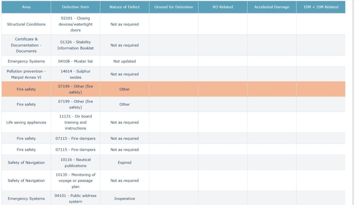 Osim ovog nedostatka, inspekcija je otkrila i nekoliko drugih problema vezanih uz sigurnost plovidbe, kao što su zastarjela nautička dokumentacija, manjkavosti u protupožarnoj zaštiti te neadekvatno praćenje plana plovidbe. Ovi nalazi ukazuju na to da postoji značajan prostor za poboljšanje u nadzoru nad sigurnošću broda te u provođenju međunarodnih sigurnosnih standarda.