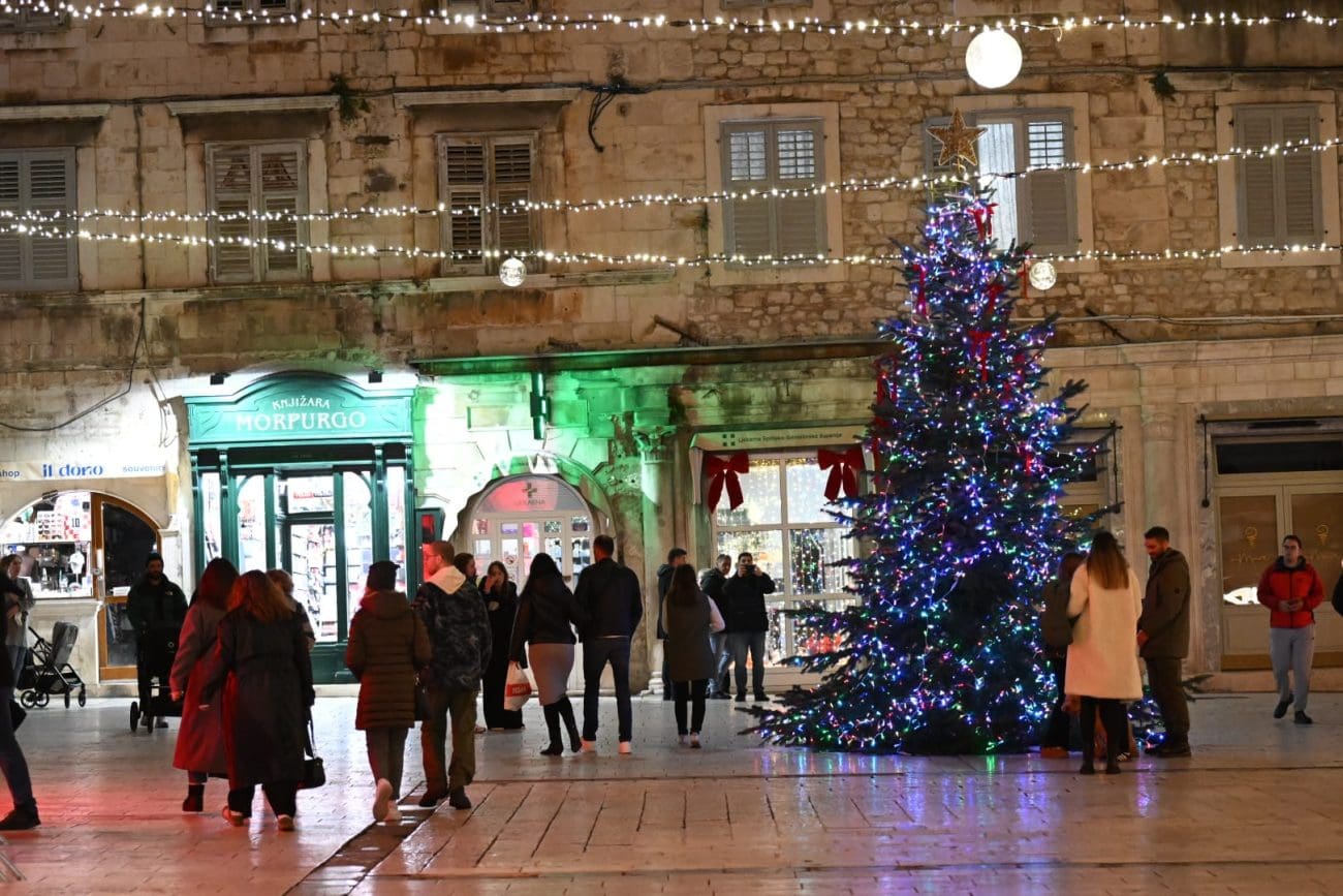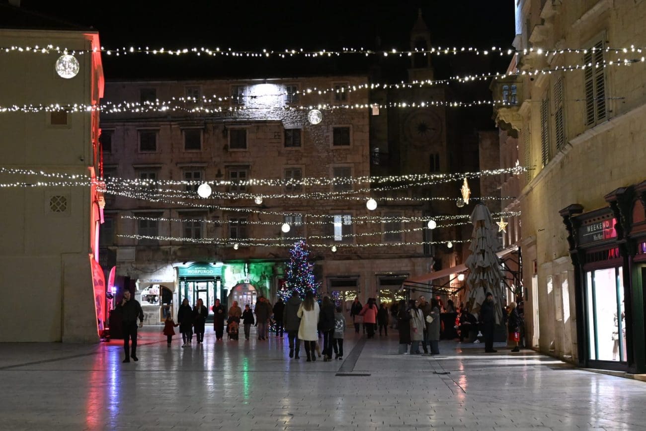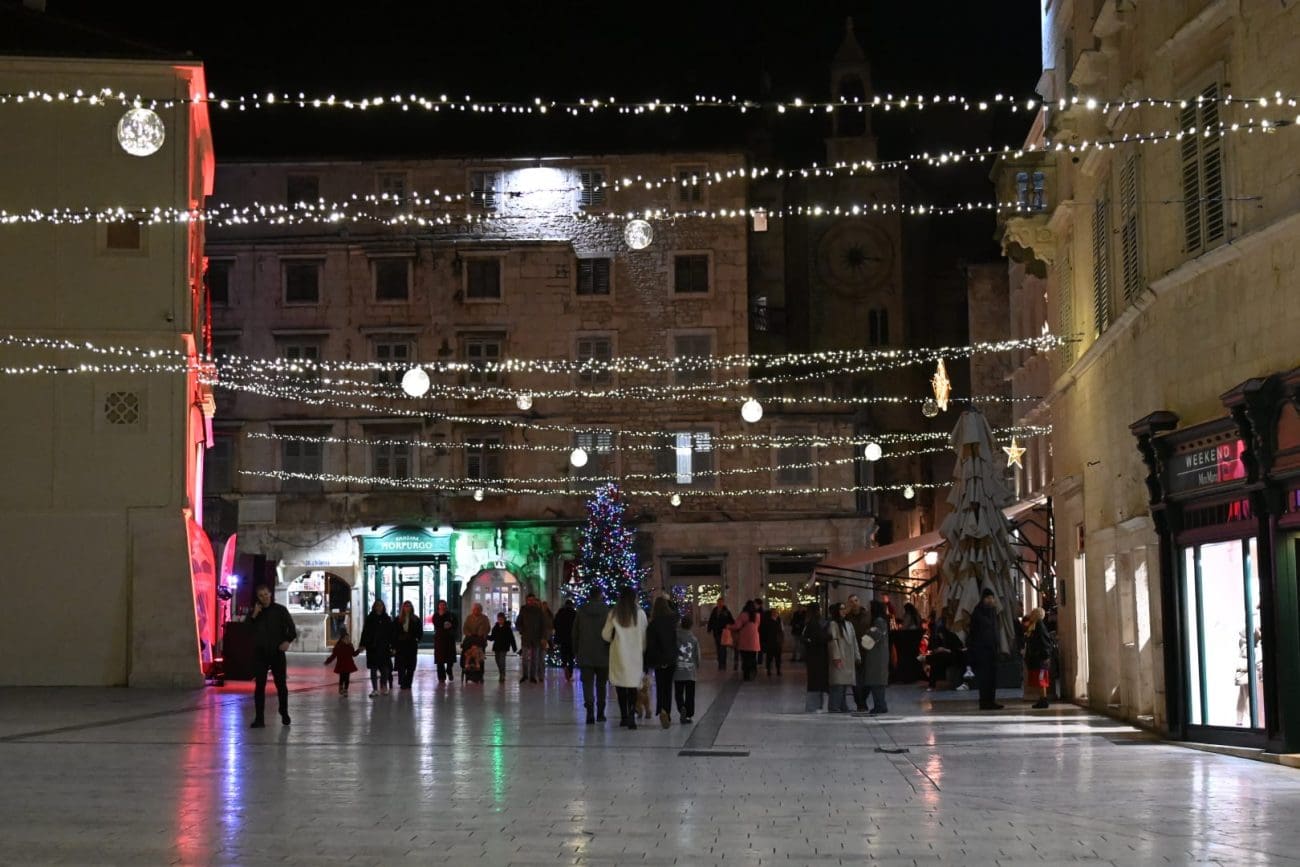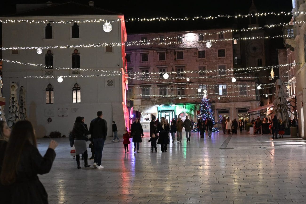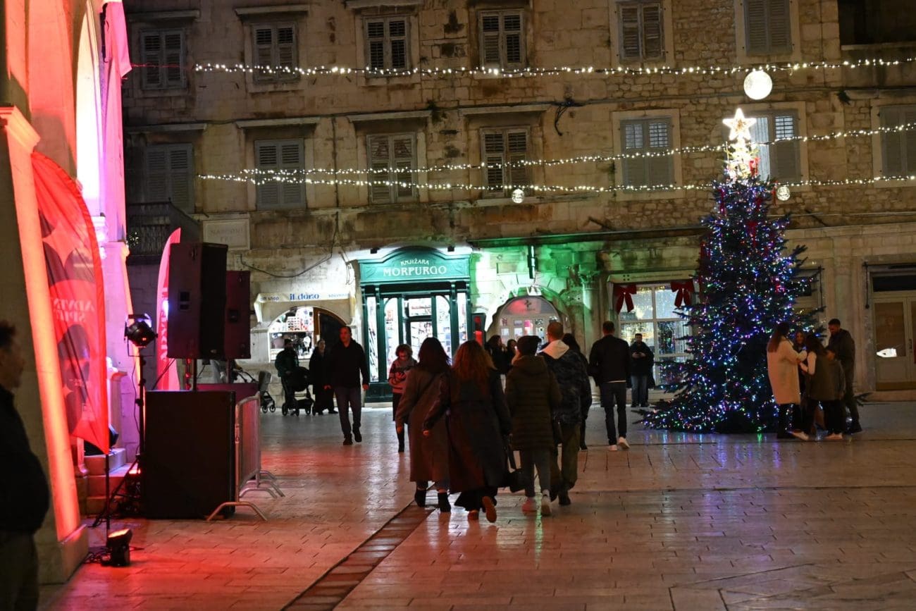 Pjaca je, kao i uvijek, izgledala bajkovito. Osvjetljeni pročelja, veliki broj šetača i blagdanski detalji koji ističu ljepotu povijesne jezgre dali su joj poseban šarm. Terase su bile pune, a kroz mnoštvo ljudi provlačila se ona prepoznatljiva energija koja Split čini živim u svako doba godine, ali u adventu posebno.