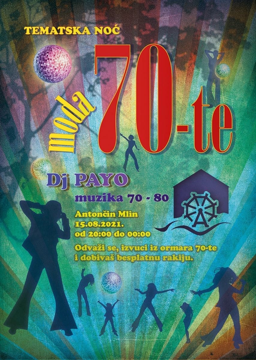 Naime, popularno Seosko gospodarstvo Antoničin mlin, organizira u nedjelju 15.8. s početkom u 20 sati tematsku noć "Moda '70.-te" uz DJ Payu i glazbu sedamdesetih i osamdesetih godina.