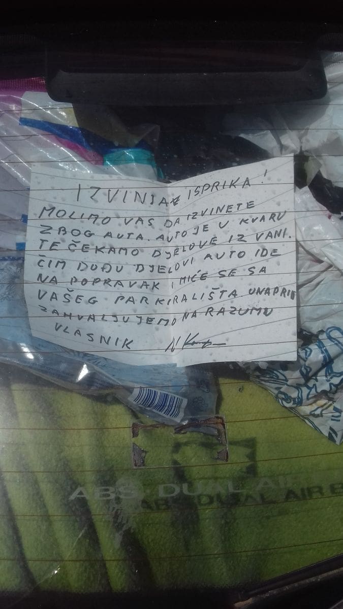 Naime, vlasnik neregistriranog automobila vjerojatno čeka auto dijelove iz inozemstva kako bi popravio svoj automobil, a tu poruku napisao je i na papiru koji je ostavio ispod stražnjeg stakla vozila.