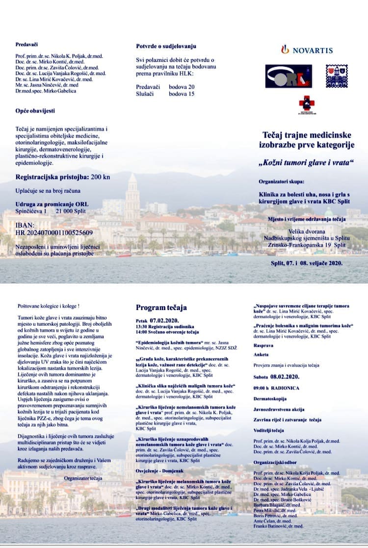 Nastavni zavod za javno zdravstvo Splitsko-dalmatinske županije u suradnji s Klinikom za uho, grlo, nos te Klinikom za dermatovenerologiju KBC-a Split organizira Tečaj trajne edukacije 1. kategorije o tumorima kože, glave i vrata.