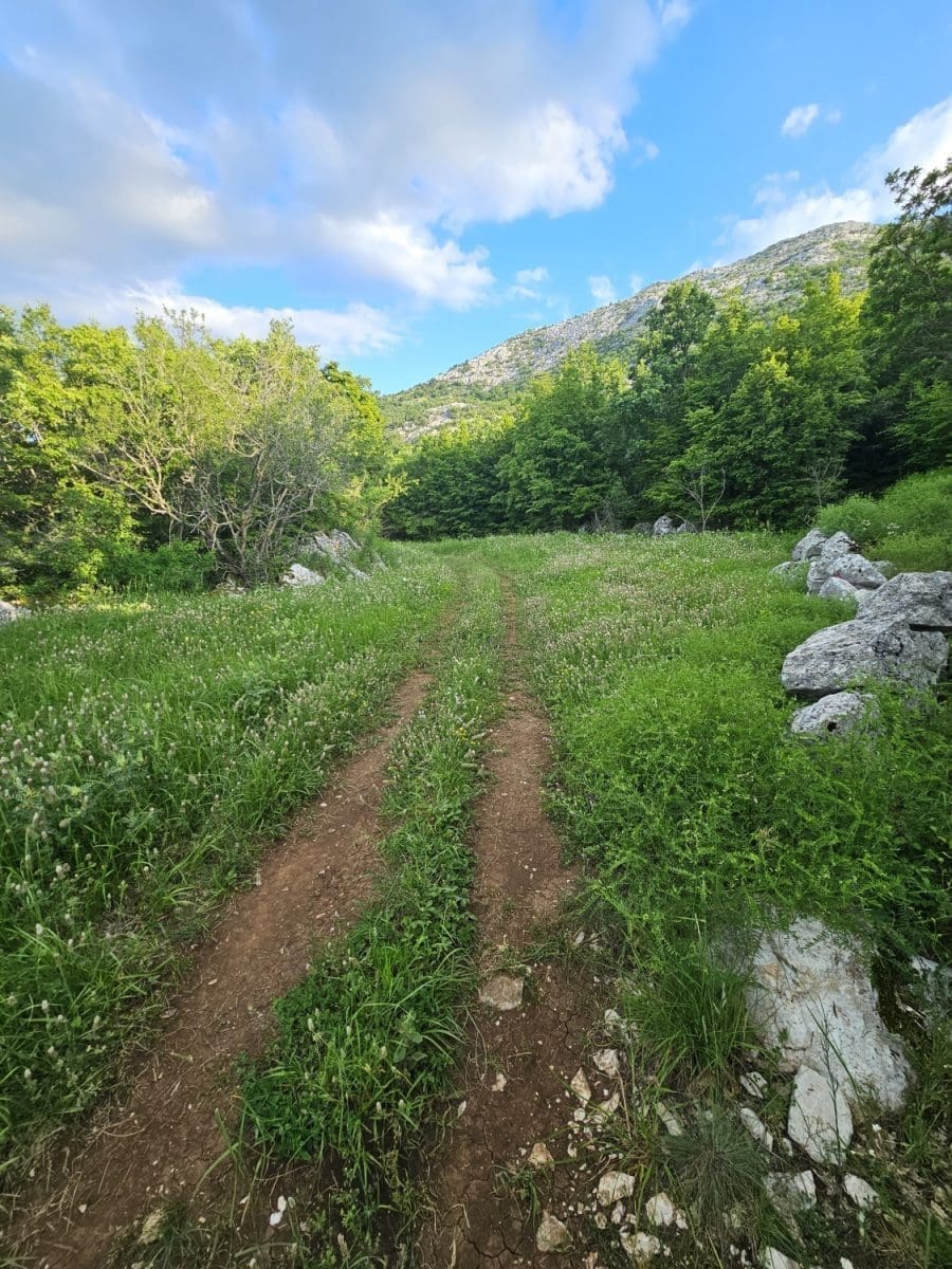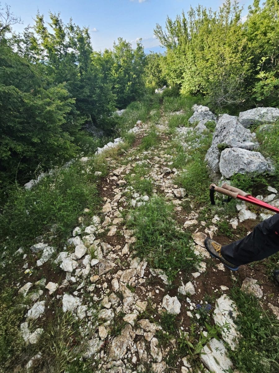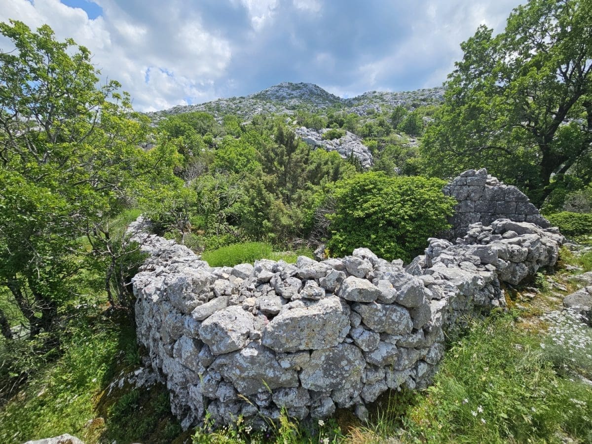 Nakon odmora i okrijepe krećemo prema Dugopolju istočnom stazom. Prvi nekoliko stotina metara staza je izrazito loše označena pa budite izrazito koncentrirani, a potom se stanje donekle popravi. Napušteni mosorski zaselci ovoj stazi daju posebnu čar, a čari nedostaje ni kada se spustite na oko 650 metara nadmorske visine i kada predivna planinarska staza postane staza za kvadova. Radi se o stazi nastaloj relativno nedavno kada su se dinamitom dizali mosorska stina i stari suhozidi dugopoljskih pradjedova. Sami smo su uvjerili koliko je ovaj dio staze nepraktičan za spust kada je jedan planinar otresalo na leđa zbog više nego nezgodne staze.
