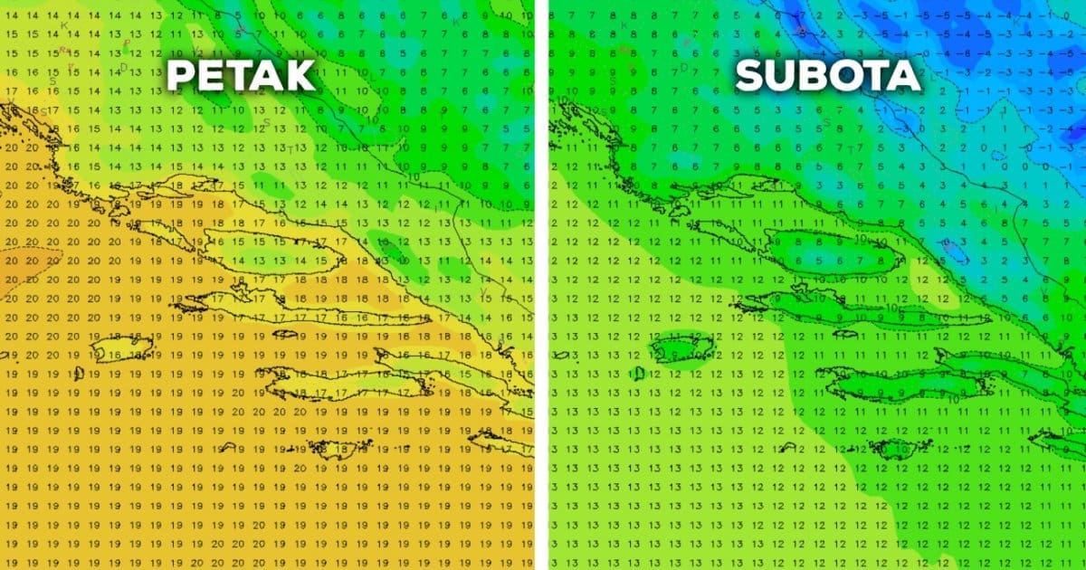 Danas će biti oblačno uz kišu te mjestimične pljuskove s grmljavinom. Lokalno su mogući izraženiji neverini i preko 50 litara kiše po metru kvadratnome. U drugom dijelu dana oborine će slabiti i prestati, a navečer će se i razvedriti. Prijepodne će puhati jako oštro i lebić s olujnim udarima na moru, ponegdje do 100 km/h. Uz obalu i na otocima mjestimice ciklonalna plima koja će preplaviti niže dijelove obale. Lebić će tijekom jutra prelaziti u pulenat, potom i tramontanu. Popodne podno Velebita umjerena do jaka bura koja će se brzo proširiti obalom. Jutro će biti najtopliji dio dana, na Jadranu će temperature ponegdje biti do čak 19°C. Popodne sve hladnije, a najhladnije će biti navečer kada će jako zahladiti, u Dalmatinskoj zagori temperature će biti jedva iznad nule.