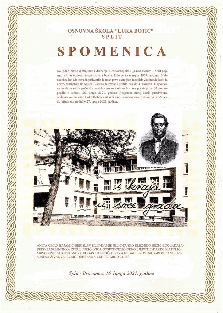 Od tada je prošlo ravnih 52 godine. Više od pola stoljeća. Tijekom osam godina u taj razred su još dolazili i odlazili neki učenici, a na kraju fuziranjem škole Luka Botić sa školom Nenad Ravlić, škola gubi svoje prvotno ime, a učenici istog razreda 1977. završavaju osmoljetno školovanje u 8 F razredu.