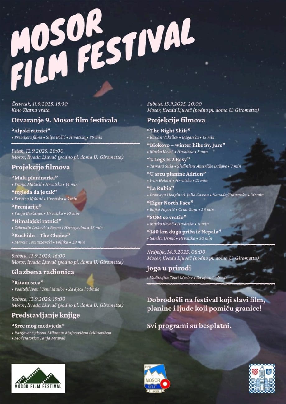 Ovogodišnji, deveti po redu festival, spaja film, planine i veliku obljetnicu HPD-a Mosor. Svi programi su besplatni, a organizatori pozivaju posjetitelje da zajedno proslave stoljeće planinarske strasti i ljubavi prema prirodi.