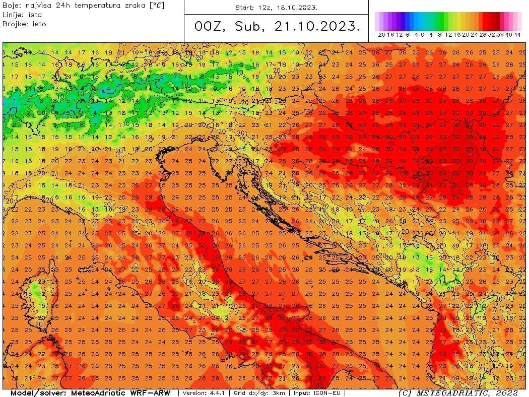 U subotu oblačno s kišom, mogući su pljuskovi s grmljavinom. Mjestimice će pasti preko 30 litara kiše po metru kvadratnome. Jugo će olujne udare imati još ujutro, oslabit će na kraju dana. Bit će toplo, a neznatno svježije navečer.