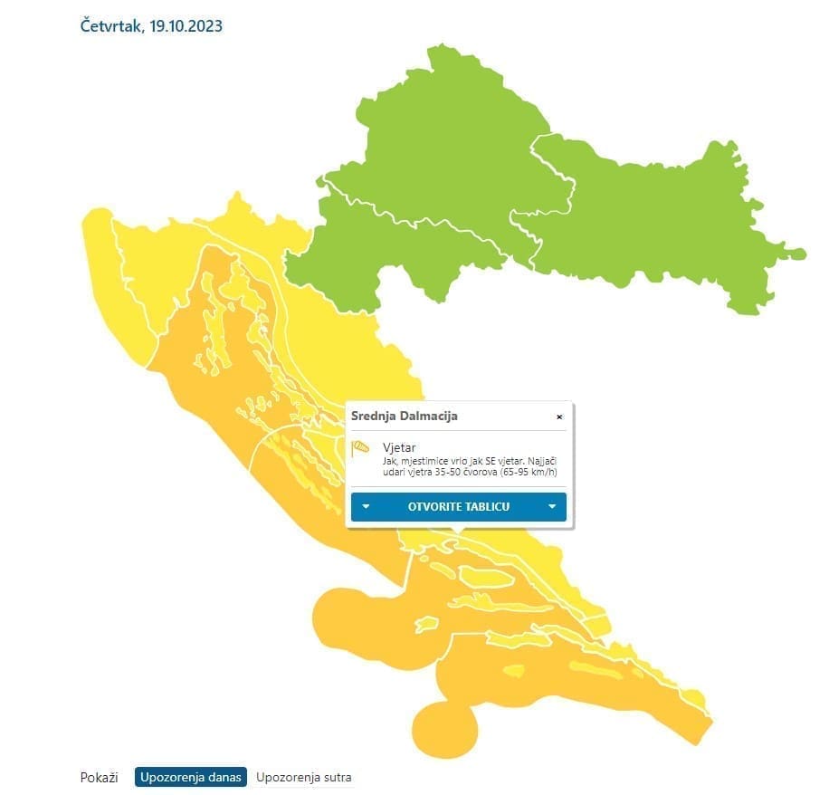 DHMZ je unutar sustava MeteoAlarm za danas izdao žuti stupanj upozorenja za obali i zaobalje, iako su predviđeni najjači udari vjetra do 65 km/h, izmjereni podaci već su prešli prognoziranu vrijednost, a jačanje se tek očekuje prema kraju dana. Za more je izdan narančasti stupanj zbog prognoziranih udara do 95 km/h, što su vrijednosti koje zasad nisu dosegnute.