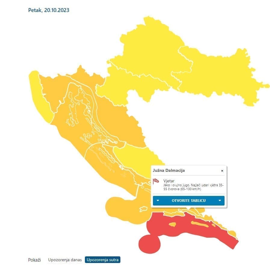 Za petak DHMZ izdaje narančasti alarm za veći dio obale, a za južni Jadran crveno upozorenje zbog očekivanih udara vjetra do 100 km/h.