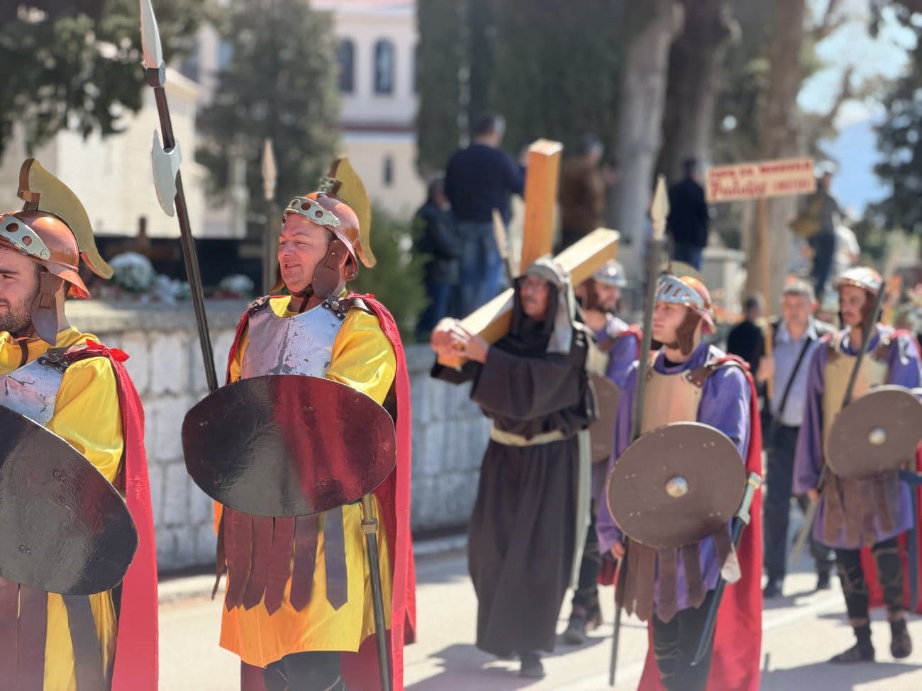 Na 25. Festivalu žudija u Katunima posjetitelji su imali priliku vidjeti pravo bogatstvo različitih odora i običaja koje njeguju čuvari Kristova groba iz brojnih župa. Fotografija zorno prikazuje raznolikost koja ovaj događaj čini posebnim – od rimskih vojnika s kacigama, štitovima i kopljima, do mornarskih i svečanih narodnih odora koje odražavaju lokalni identitet pojedinih krajeva.