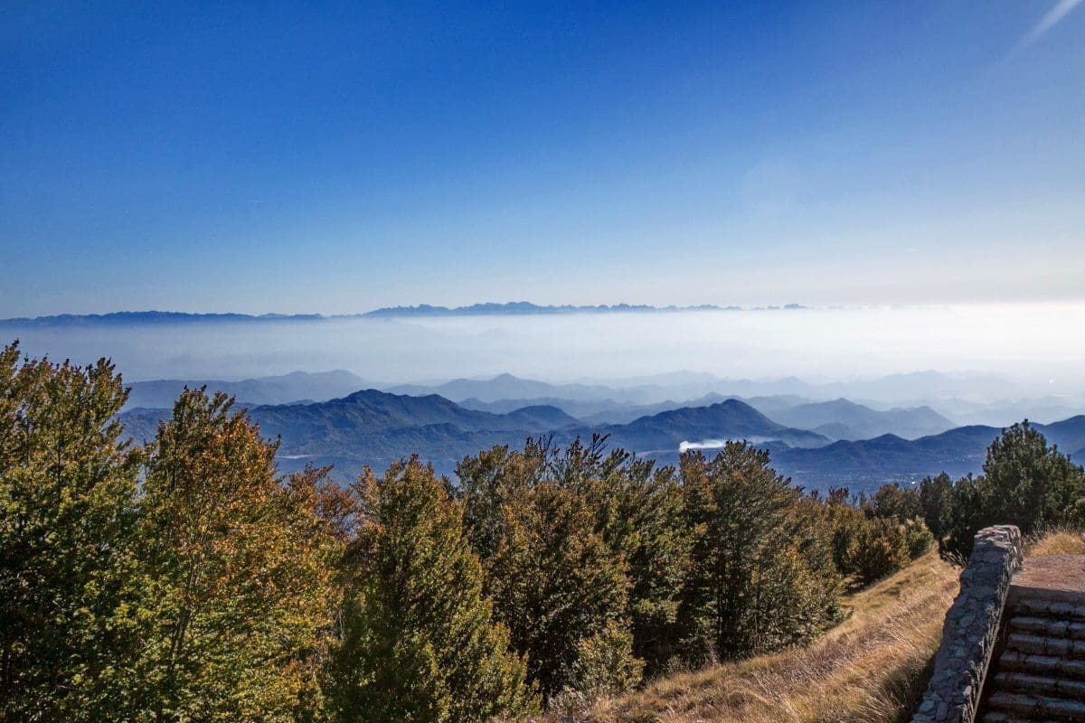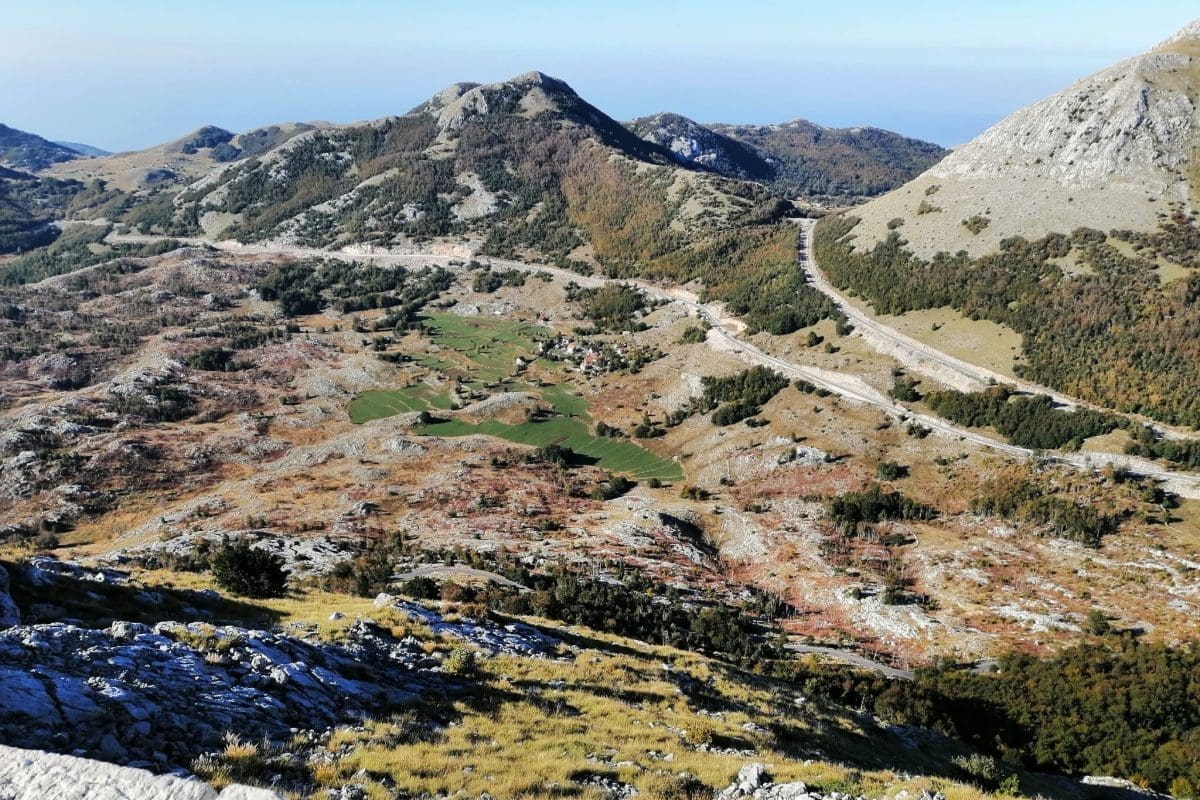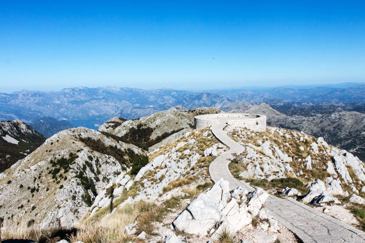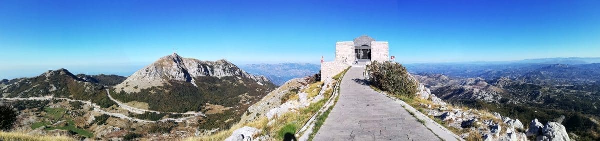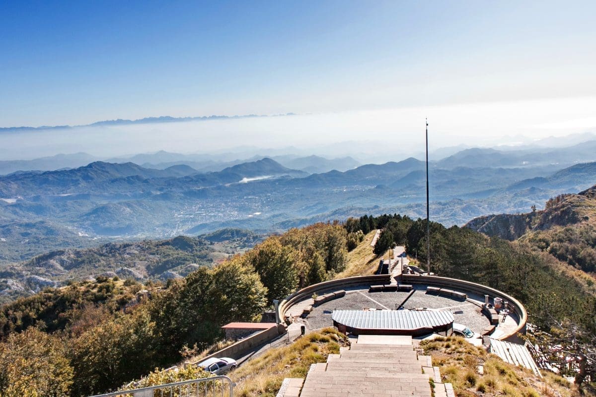 Još stotinjak metara po hrptu planine i eto nas. VOILA! Prekrasan mauzolej djeluje nestvarno u ovom okruženju. Nacrtao ga je naš Drnišanin Ivan Meštrović, ruke mu je dao arhitekt Harold Bilinić, a kip Njegoša s orlom poviše glave isklesao je Splićanin Andrija Krstulović (Meštrovićev đak). Inače mauzolej je dovršen 1974 na mjestu stare oštećene Njegoševe zavjetne crkve u kojoj je po vlastitoj želji sahranjen crnogorski vladika i pjesnik. U predvorju se ističu dvije karijatide majke i ćerke, a u samom dnu objekta je već spomenuti spomenik velikom vladaru. Prolaskom kroz mauzolej izlazi se na sjevernu stranu gdje staza vodi do još jednog vidikovca lijepog okruglog izgleda. Savršeno za fotkanje. Inače kažu da kad je dan čist da se sa Lovćena vidi cijela Crna Gora. Ja sam uspio vidjeti dosta ograničeni prostor, iako je bio izuzetno lijep i vedar dan, ali s puno vlage. Istočno ispod je Cetinje, sjeverno se vidi dio Boke, a zapadno i južno je najviši vrh Lovćena Štirovnik (1749 m n/v) sa RTV tornjem i obronci ostalog dijela planinskog masiva. Ima i manjih naselja s vrtačama i pojilima za stoku. Slijedi slikavanje, selfiranje i silazak istim putem do kafea na kafu i predobar kolač. Vodu ponesite sa sobom ako je ne želite kupiti jer postojeća kišnica u objektu nije za piće. Navodno je onečišćuje ptičji izmet na krovu.