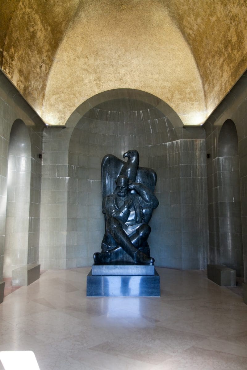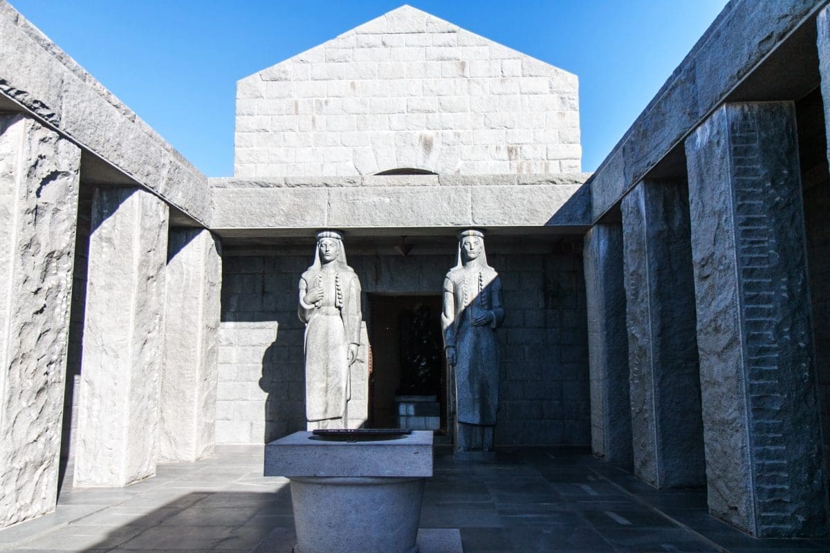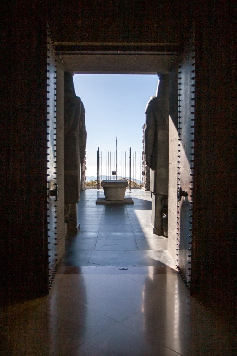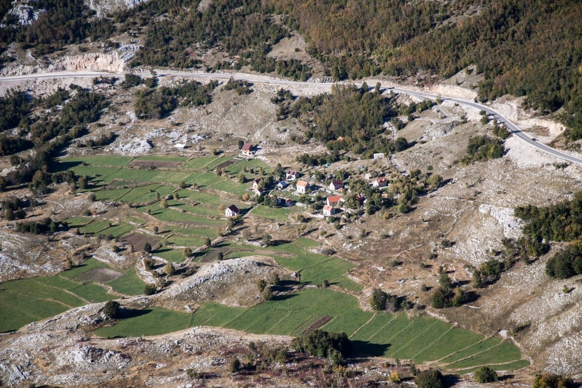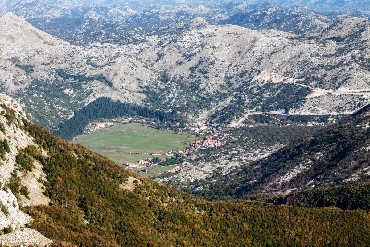 Još stotinjak metara po hrptu planine i eto nas. VOILA! Prekrasan mauzolej djeluje nestvarno u ovom okruženju. Nacrtao ga je naš Drnišanin Ivan Meštrović, ruke mu je dao arhitekt Harold Bilinić, a kip Njegoša s orlom poviše glave isklesao je Splićanin Andrija Krstulović (Meštrovićev đak). Inače mauzolej je dovršen 1974 na mjestu stare oštećene Njegoševe zavjetne crkve u kojoj je po vlastitoj želji sahranjen crnogorski vladika i pjesnik. U predvorju se ističu dvije karijatide majke i ćerke, a u samom dnu objekta je već spomenuti spomenik velikom vladaru. Prolaskom kroz mauzolej izlazi se na sjevernu stranu gdje staza vodi do još jednog vidikovca lijepog okruglog izgleda. Savršeno za fotkanje. Inače kažu da kad je dan čist da se sa Lovćena vidi cijela Crna Gora. Ja sam uspio vidjeti dosta ograničeni prostor, iako je bio izuzetno lijep i vedar dan, ali s puno vlage. Istočno ispod je Cetinje, sjeverno se vidi dio Boke, a zapadno i južno je najviši vrh Lovćena Štirovnik (1749 m n/v) sa RTV tornjem i obronci ostalog dijela planinskog masiva. Ima i manjih naselja s vrtačama i pojilima za stoku. Slijedi slikavanje, selfiranje i silazak istim putem do kafea na kafu i predobar kolač. Vodu ponesite sa sobom ako je ne želite kupiti jer postojeća kišnica u objektu nije za piće. Navodno je onečišćuje ptičji izmet na krovu.