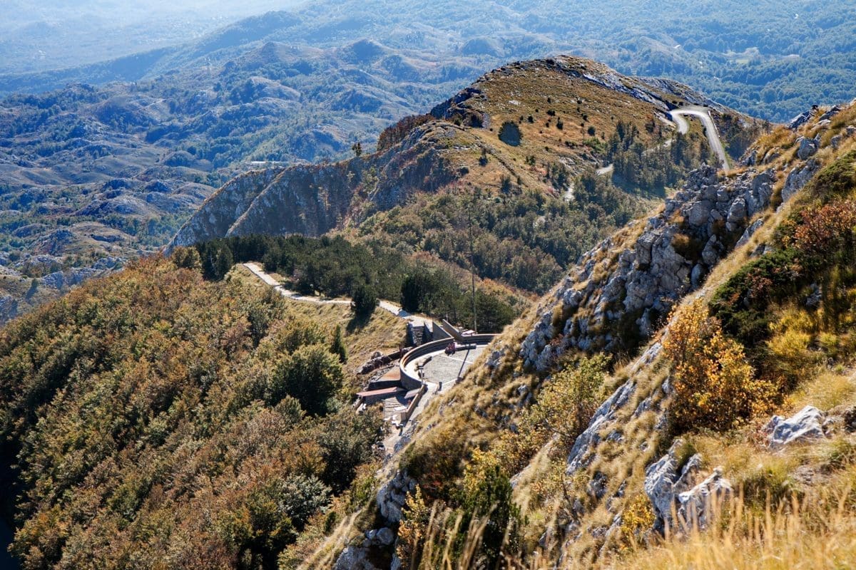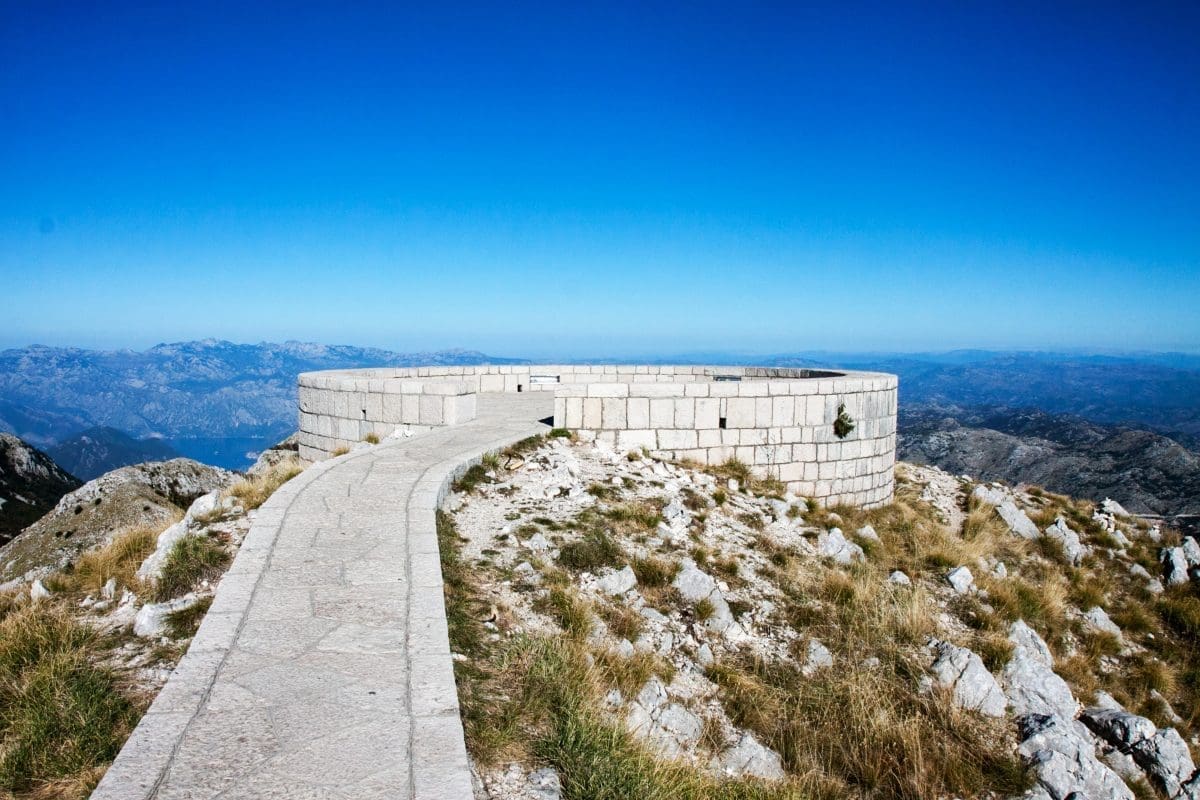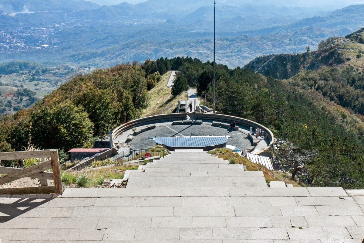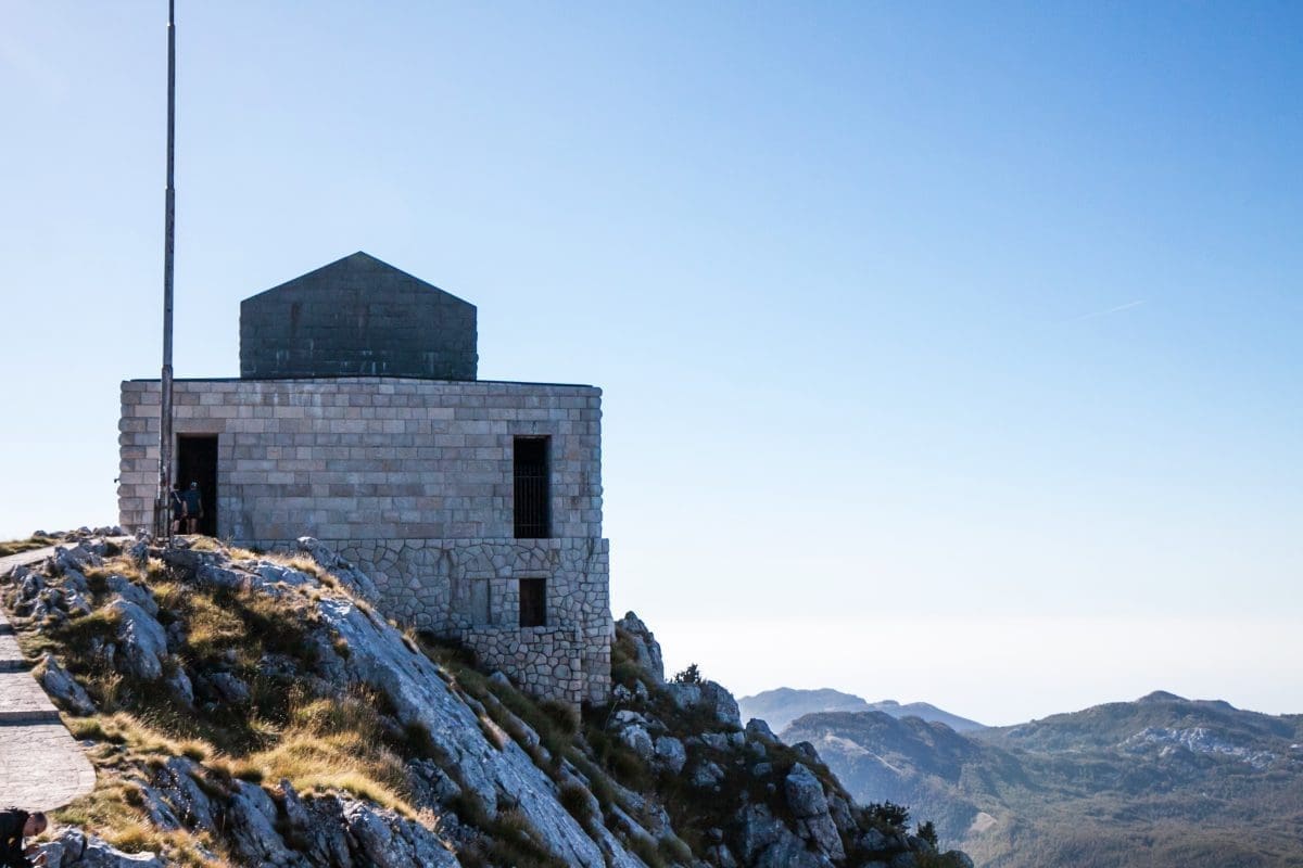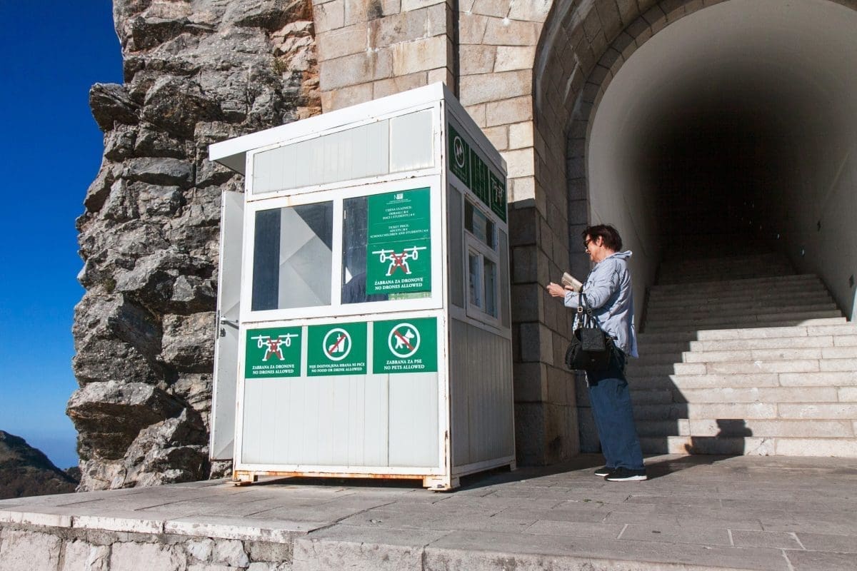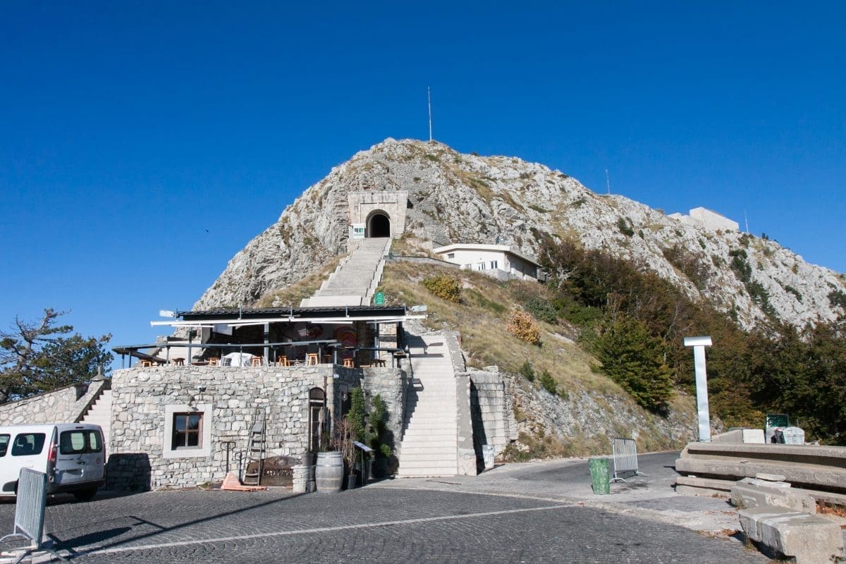 Kad dođete na vrh serpentina cesta se pretvara u modernu novu prometnicu koja blagim usponom vijuga prema mauzoleju. Negdje 11 km prije cilja ova cesta se spaja sa onom iz pravca Cetinja i tu počinje NP Lovćen sa mnoštvom sadržaja za one koje žele tu provesti više vremena. Ulaznica je 2 € po osobi za 1 dan. Cesta je i dalje odlična sve do 1 km prije skretanja za Jezerski Vrh na 1660 m n/v gdje je sagrađen velebni mauzolej. Nakon tog jednog km stižemo na cilj tj do okretišta za aute i parkirališta uz cestu prema dolje. Na okretištu je vidikovac, a tu su i kafić i restoran koji rade od 9:00 do mraka. Ugodno mjestašce za predahnuti i ako ste gladni za prezalogajiti. Sad slijedi onaj najtežio dio tj noćna mora za ljude bez kondicije u koje i sam spadam. Nakon što iskeširate za ulaznicu 8 € po glavi pustiće vas da učinite 461 skalinu kroz, u živoj stijeni probijeni, tunel do zadnjeg počivališta PPNJ drugog. Tunel je fino osvijetljen i nakon svakih 9 stepenica imamo podest od par metara tako da laganim tempom i grčevima u nogama stižemo do „svjetla na kraju tunela“.