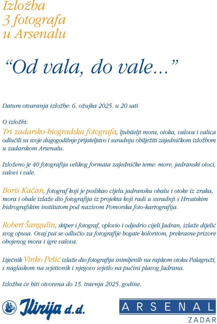 Tri zadarsko-biogradska fotografa, ljubitelji mora, otoka, valova i valica odlučili su svoje dugogodišnje prijateljstvo i suradnju obilježiti zajedničkom izložbom u zadarskom Arsenalu koja se otvara 6. ožujka 2025. u 20 sati.