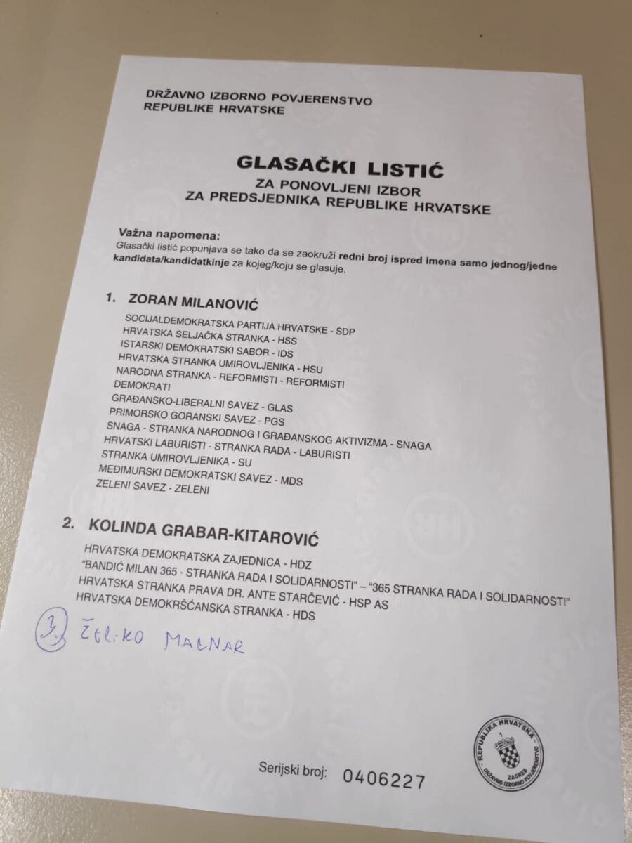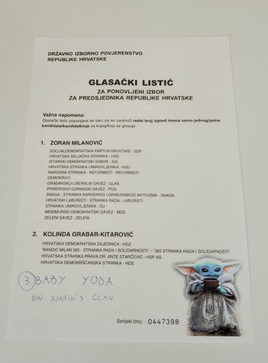 DIP je objavio da je do 16:30 glasovalo 190 tisuća ljudi više nego u prvom krugu. Ako je suditi prema fotografijama koje kruže društvenim mrežama, Željko Malnar će skupiti respektabilan broj glasova. Osim za njega, birači su kao trećeg ili nekog sljedećeg kandidata nadopisivali Yodu, nogometne trenere, pjevače, likove iz crtića...