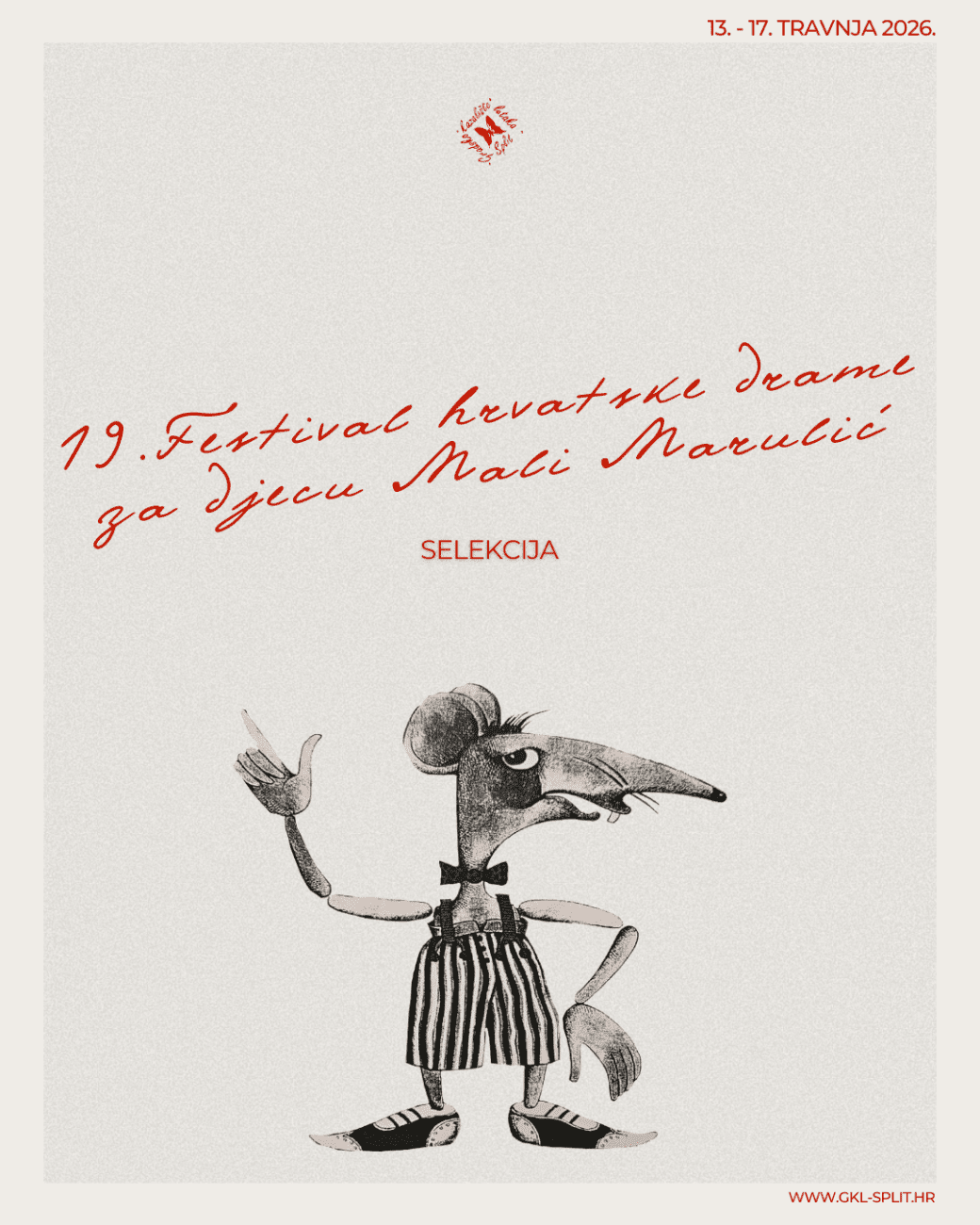Devetnaesto izdanje Festivala hrvatske drame za djecu Mali Marulić, u organizaciji Gradskog kazališta lutaka Split, održat će se u Splitu od 13. do 17. travnja 2026. godine. U pet festivalskih dana publici će se predstaviti osam kazališta s naslovima odabranima za natjecateljski program.