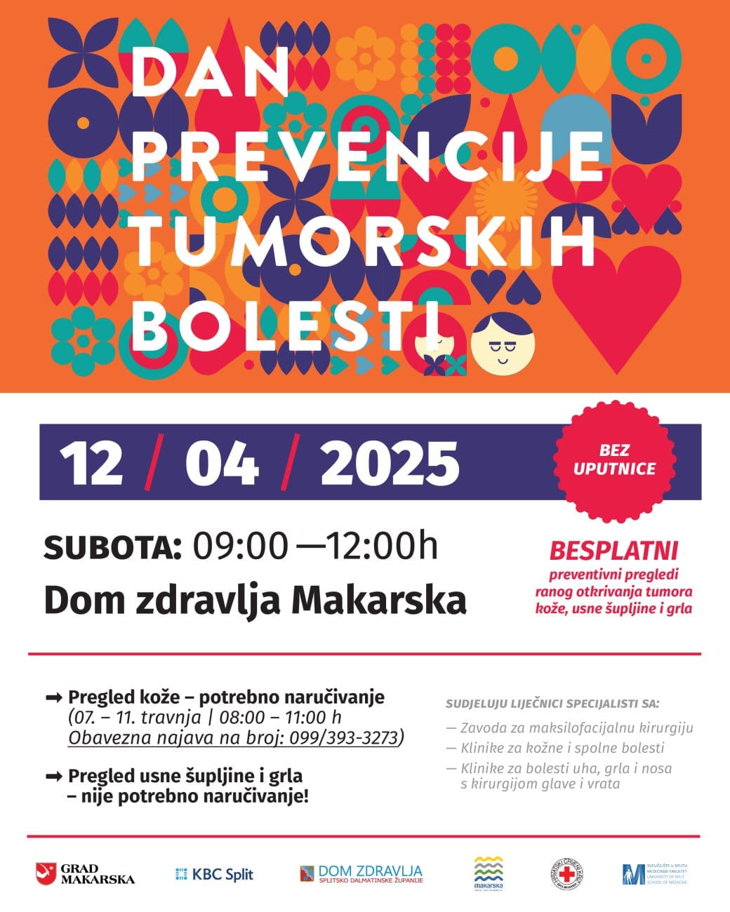 Grad Makarska i Klinički bolnički centar Split, u prostoru makarske ispostave Doma zdravlja Splitsko-dalmatinske županije, organiziraju Dan prevencije tumorskih bolesti. Održat će se u subotu, 12. travnja 2025. godine od 9:00 do 12:00 sati.