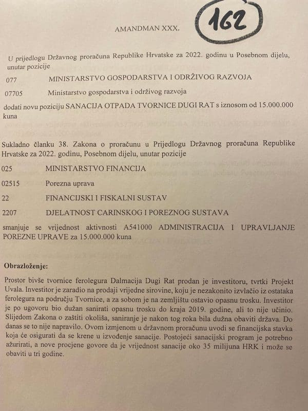 - Obrazloženje kojim je Vlada odbila rezervirati 15 milijuna Kuna za prvu ratu sanacije šljake na prostoru bivše Tvornice Dalmacija Dugi Rat je skandalozan. Državni tajnik kaže kako je odobren program sanacije i nije potrebno rezervirati sredstva u proračunu Ministarstva.