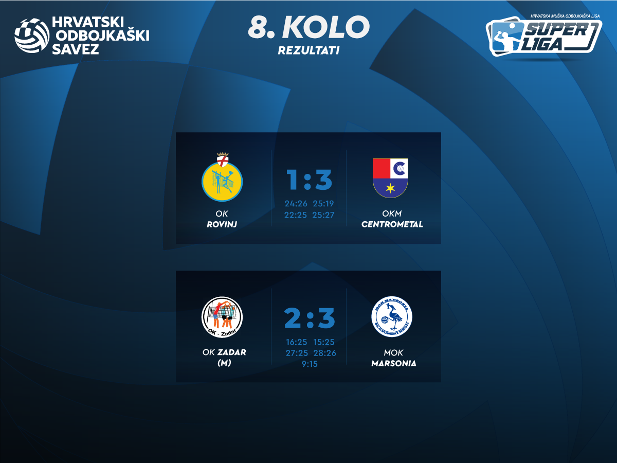 U osmom kolu Superlige za seniore odigrale su se samo dvije utakmice. OKM Centrometal pobijedio je OK Rovinj 1:3 (24:26, 25:19, 22:25, 25:27) dok je momčad OK Zadar izgubila od MOK Marsonia 2:3 (16:25, 15:25, 27:25, 28:26, 9:15). Ostali susreti (HAOK Mladost-OK Kitro Varaždin, OK Sisak-MOK Mursa-Osijek, OK Split- OK Ribola Kaštela) su odgođeni.