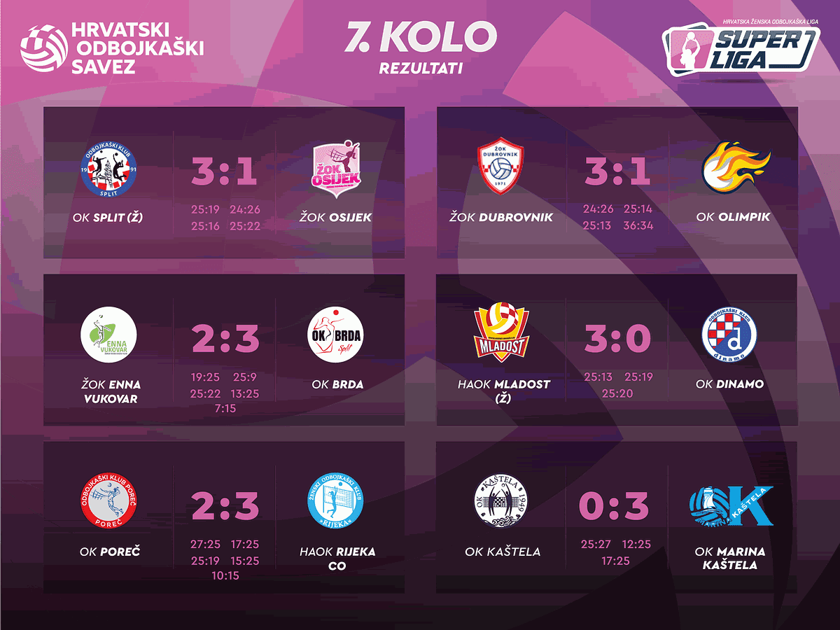 Sedmo kolo Superlige za odbojkašice obilježili su zagrebački i kaštelanski derbi. Odbojkašice HAOK Mladost uvjerljivo su slavile nad OK Dinamom 3:0 (25:13, 25:19, 25:20) dok je ekipa OK Marina Kaštela bila bolja od OK Kaštela istim rezultatom (27:25, 12:25, 17:25).