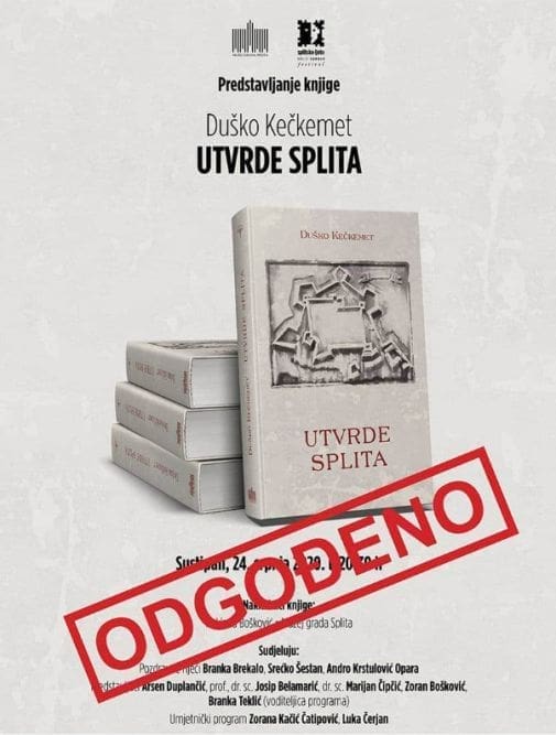 Promocija knjige "Utvrde Splita" Duška Kečkemeta odgođena je zbog vremenskih neprilika. Promocija je trebala biti održana večeras na Sustipanu, s početkom u 20.30 sati.