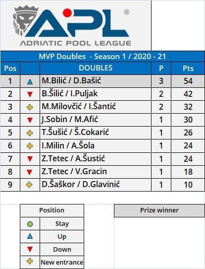 Nakon drugog kola i četiri dvoboja na prvom mjestu je ekipa Zeus, drugi su Zeus 2, a treći OlimPink. U poretku parova Bilić i Bašić su prvi sa 54 , drugi Šilić i Puljak s 42, treći M. Milovčić i Šantić sa 32 boda i tako dalje.