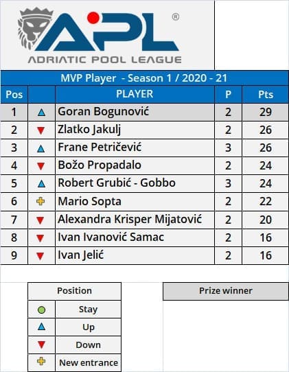 U pojedinačnoj konkurenciji Goran Bogunović ima 29 bodova, zatim slijede Zlatko Jakulj i Frane Petričević sa po 26 bodova itd.