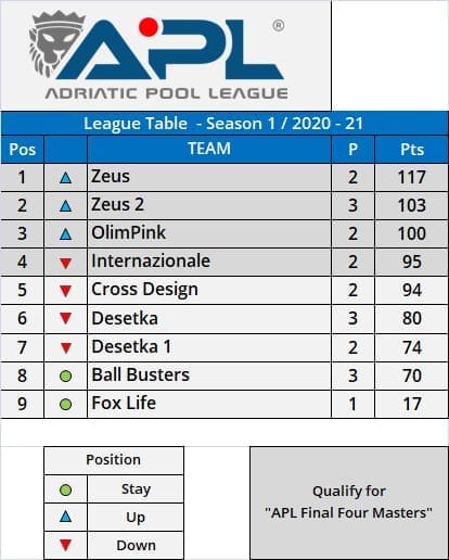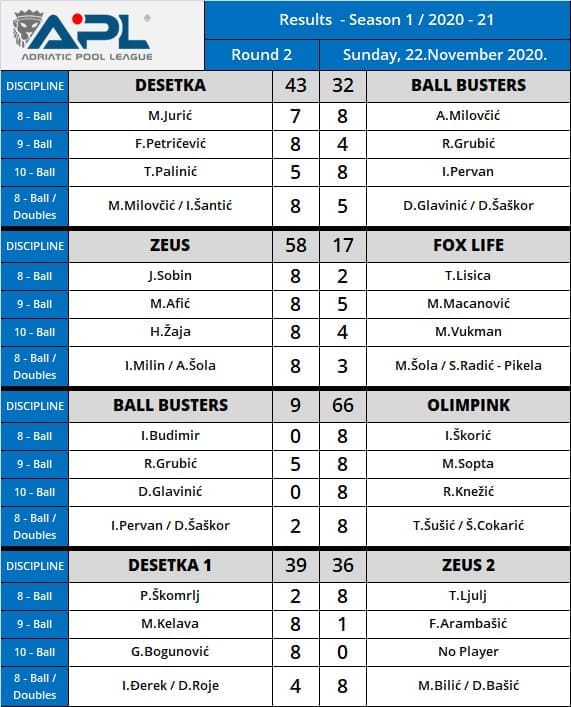 Ovog vikenda odigrano je 2. kolo Adriatic pool league (Jadranska biljar liga), koja okuplja Dalmatinske ekipe, natjecatelje u pojedinačnoj konkurenciji te parove. Domaćini ovog vikenda bili su biljarski klubovi: “Beretka”, “Desetka” i “Zeus".