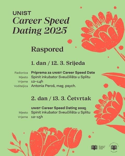 U organizaciji Sveučilišta u Splitu Ureda za upravljanje karijerama zajedno sa Sveučilišnim odjelom za stručne studije i ove godine održat će se manifestacija UNIST Career Speed Dating. Manifestacija će se održati 12. i 13. ožujka u dvorani Spinit inkubatora Sveučilišta u Splitu na adresi Matoševa 56.