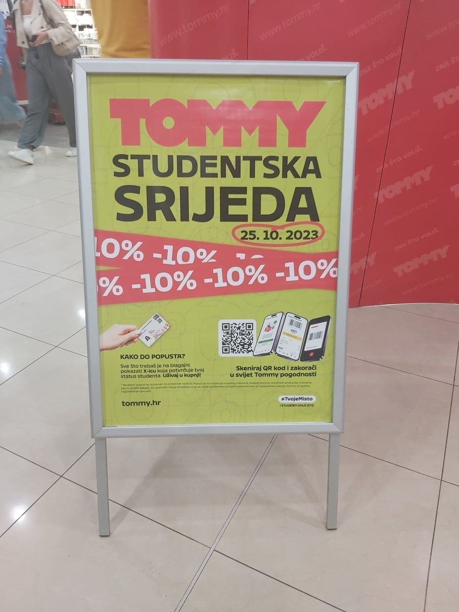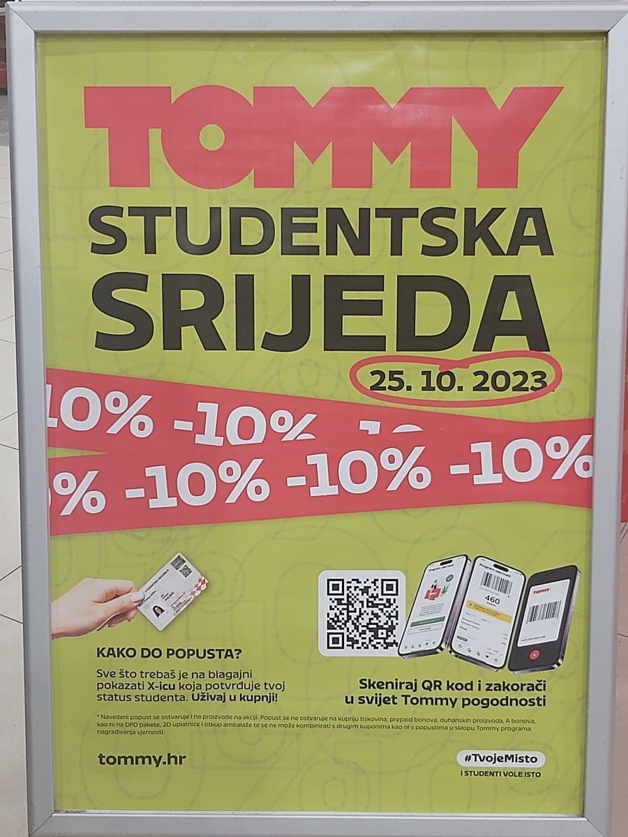 Danas studentima stiže itekako sretna vijest - Tommy počinje projekt 'TOMMY STUDENTSKA SRIJEDA' koji će svake posljednje srijede u mjesecu svim studentima u prodavaonicama diljem Hrvatske uz predočenje studentskog dokumenta (iksice) omogućiti 10% popusta na cjelokupni asortiman. Prva studentska srijeda već je sutra, 25. listopada!
