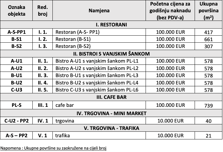 Projekt uključuje izgradnju ukupno 11 objekata: tri restorana, pet bistroa s vanjskim šankom, jedan caffe bara, jedau trgovinu i jednu trafiku.