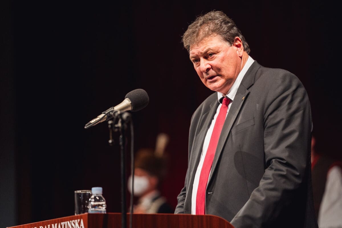 Prije početka svečanosti Dana županije ispred Hrvatskog narodnog kazališta u izjavi se novinarima obratio predsjednik Skupštine Splitsko-dalmatinske županije HGS-ov Petroslav Sapunar.