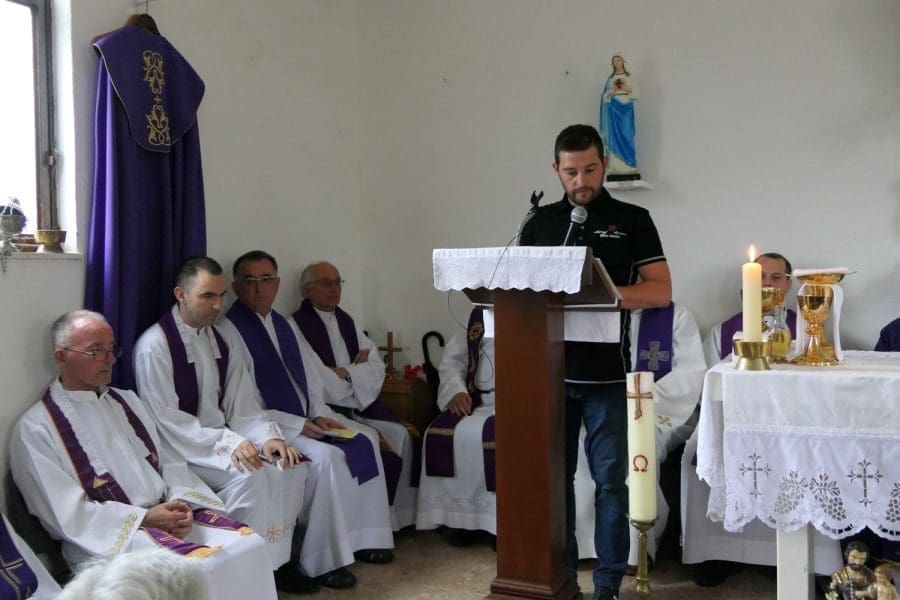 Don Franjo Frankopan je na početku mise kazao da su splitsko-makarski nadbiskup Dražen Kutleša i umirovljeni nadbiskup Marin Barišić zajedno u molitvi s obiteljima žrtava i sa svim nazočnima. Istaknuo je da kao kršćani činimo tjelesno i duhovno djelo milosrđa: tjelesno, da nakon brojnih desetljeća pokapamo žrtve strašnih zločina i duhovno da se za njih molimo jer nisu umrli na prirodan način nego je iznenada, brutalno na najgori mogući način njihov život prekinut. Pozdravio je obitelji, potomke žrtava, predstavnike civilnih vlasti Republike Hrvatske: izaslanika predsjednika Sabora saborskog zastupnika Luku Brčića, izaslanicu potpredsjednika Vlade RH i ministra hrvatskih branitelja Ivonu Paltrinieri, ministricu regionalnog razvoja i fondova EU Natašu Tremišak, zamjenike splitsko-dalmatinskog župana: Antu Šošića i Stipu Čogelju, načelnika Općine Zagvozd Miroslava Gaću i druge načelnike. Iako je od ekshumiranih 30 žrtava Drugoga svjetskog rata identificirano njih 10, Bog poznaje svaku žrtvu po imenu, naglasio je predvoditelj mise.