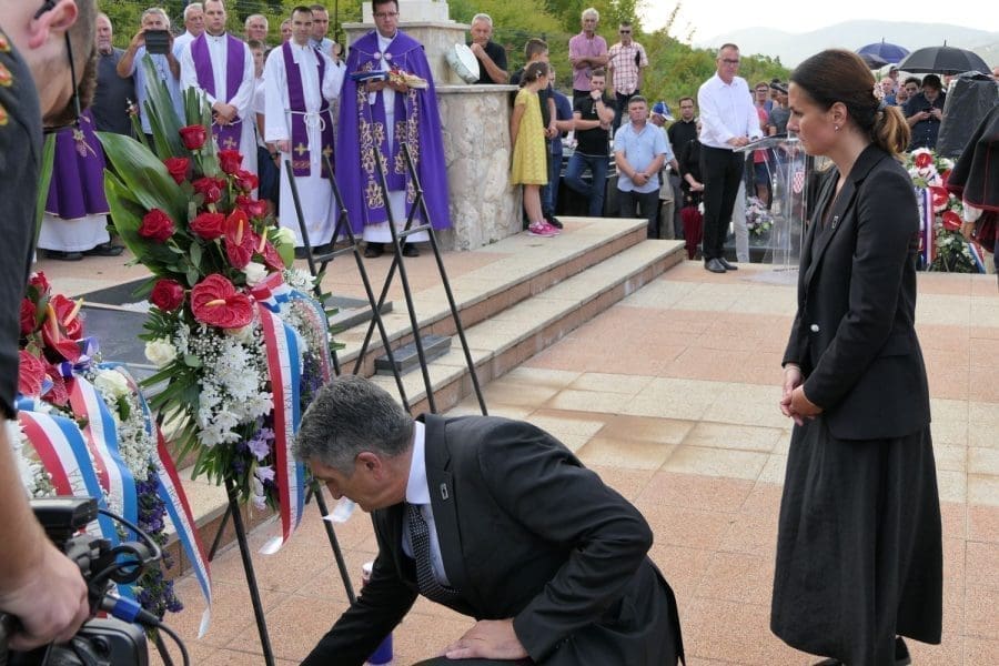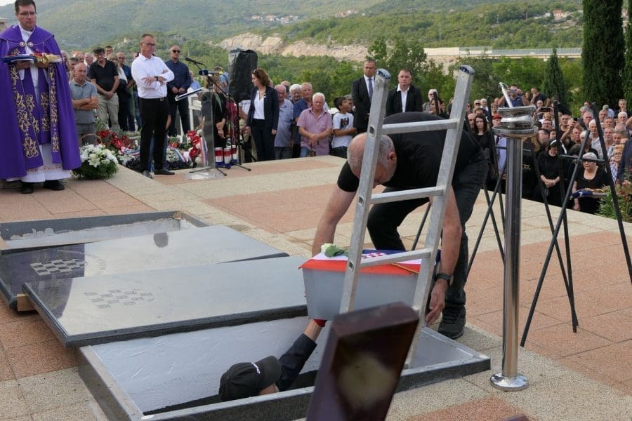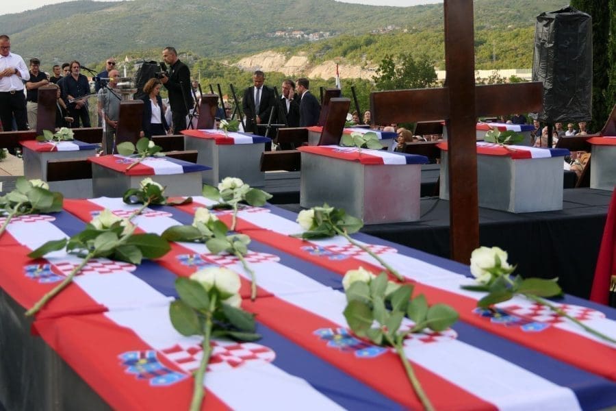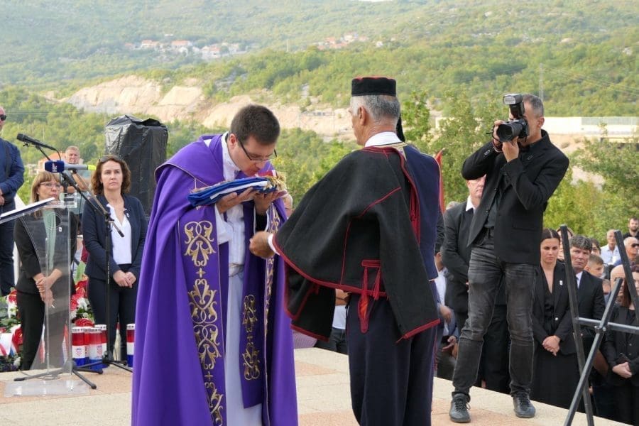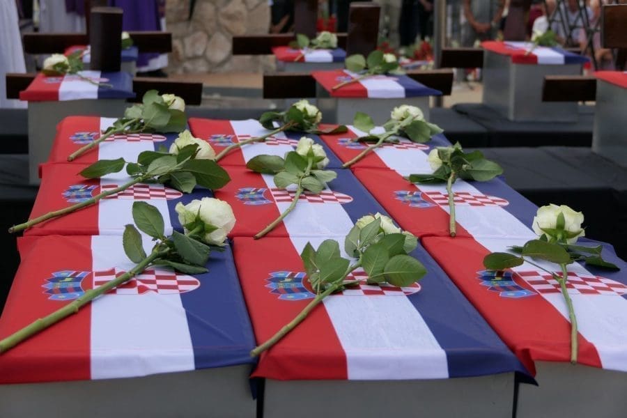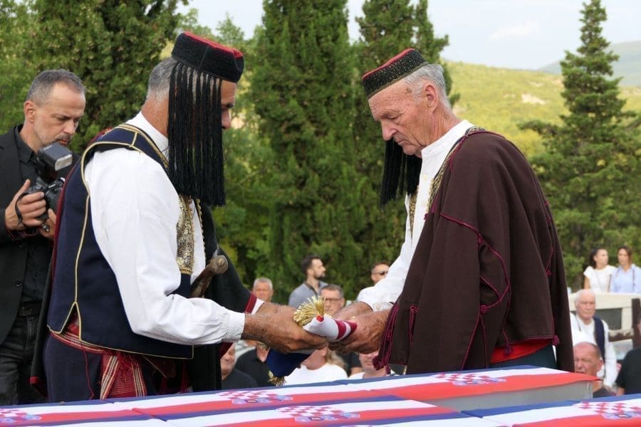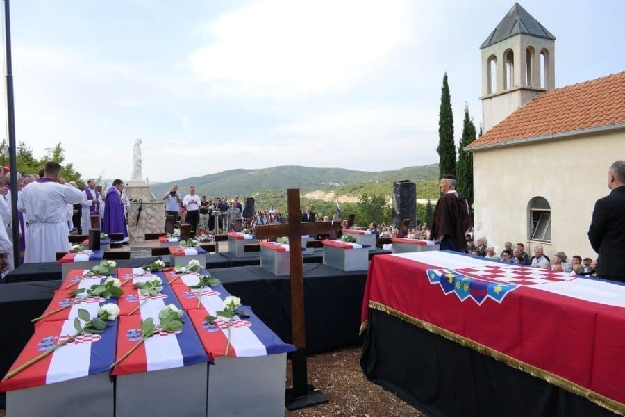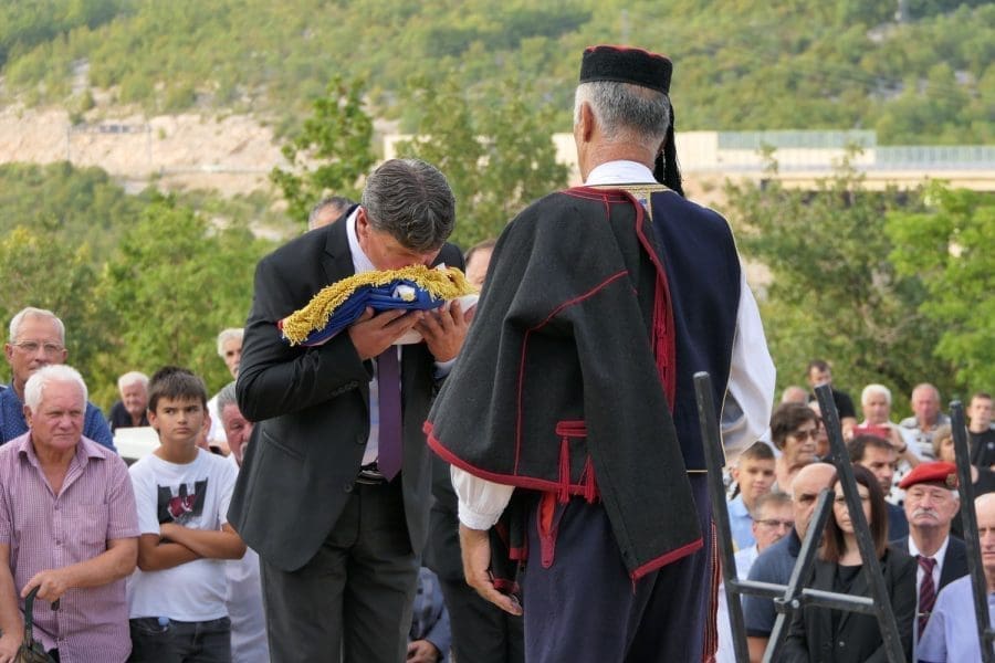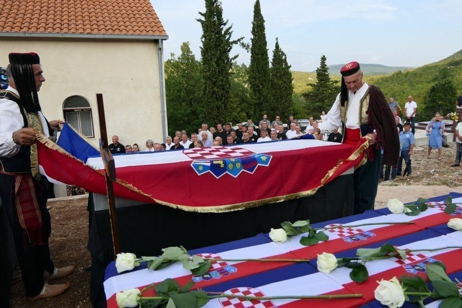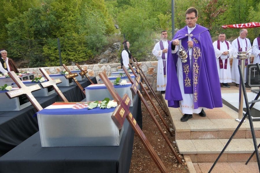 Potom je uslijedilo slaganje državne zastave i predaja zastava za župu generalnom vikaru, za Općinu Zagvozd načelniku i za obitelji žrtava gđi Ruži Mikulić, čiji otac ostaje pokopan u zajedničkoj grobnici. Prvo su ceremonijalno spuštena dva mala lijesa s posmrtnim ostacima identificiranih osoba, a potom ostalih 20 malih ljesova s neidentificiranim žrtvama. Nakon toga položeni su vijenci, a program je završio hrvatskom himnom „Lijepa naša domovino“.