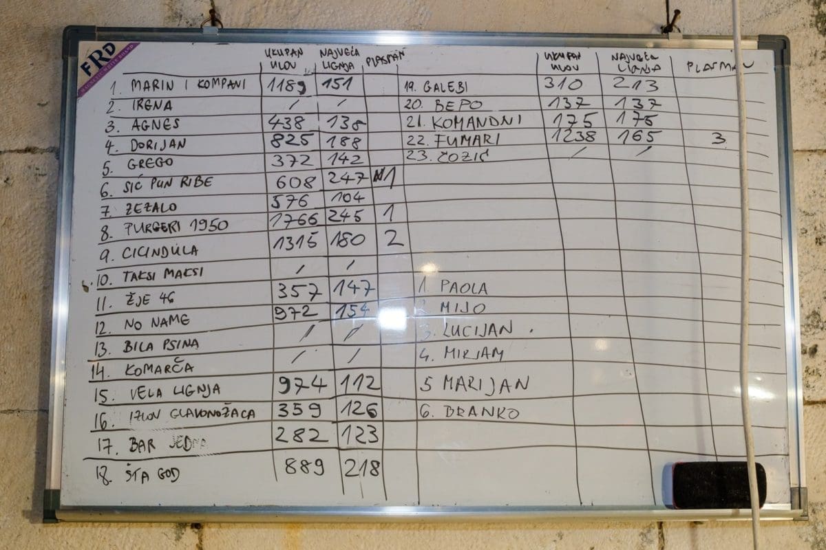 Ukupno je ulovljeno 12,8 kg liganja, a najuspješnije su bile ekipe: FUMARI (3. mjesto s 1238 gr), CICINDULA (2. mjesto s 1315 gr) i PURGERI 1950 (1. mjesto s 1766 gr), dok je posebna nagrada za najveću lignju natjecanja pripala ekipi SIĆ PUN RIBE gdje je lignju od 247 gr ulovila Dina Mlinac.